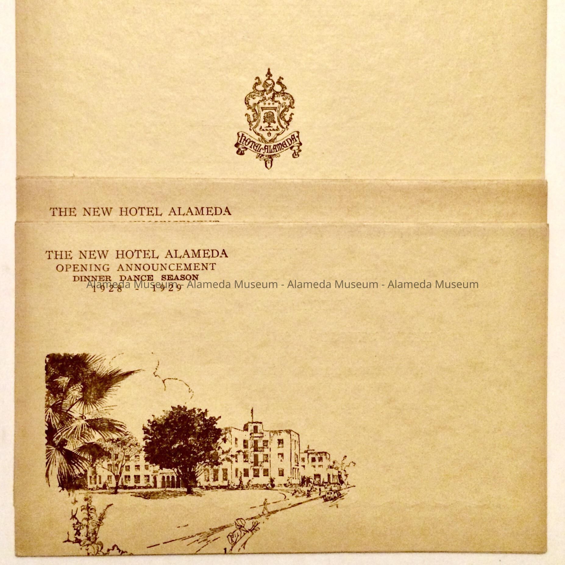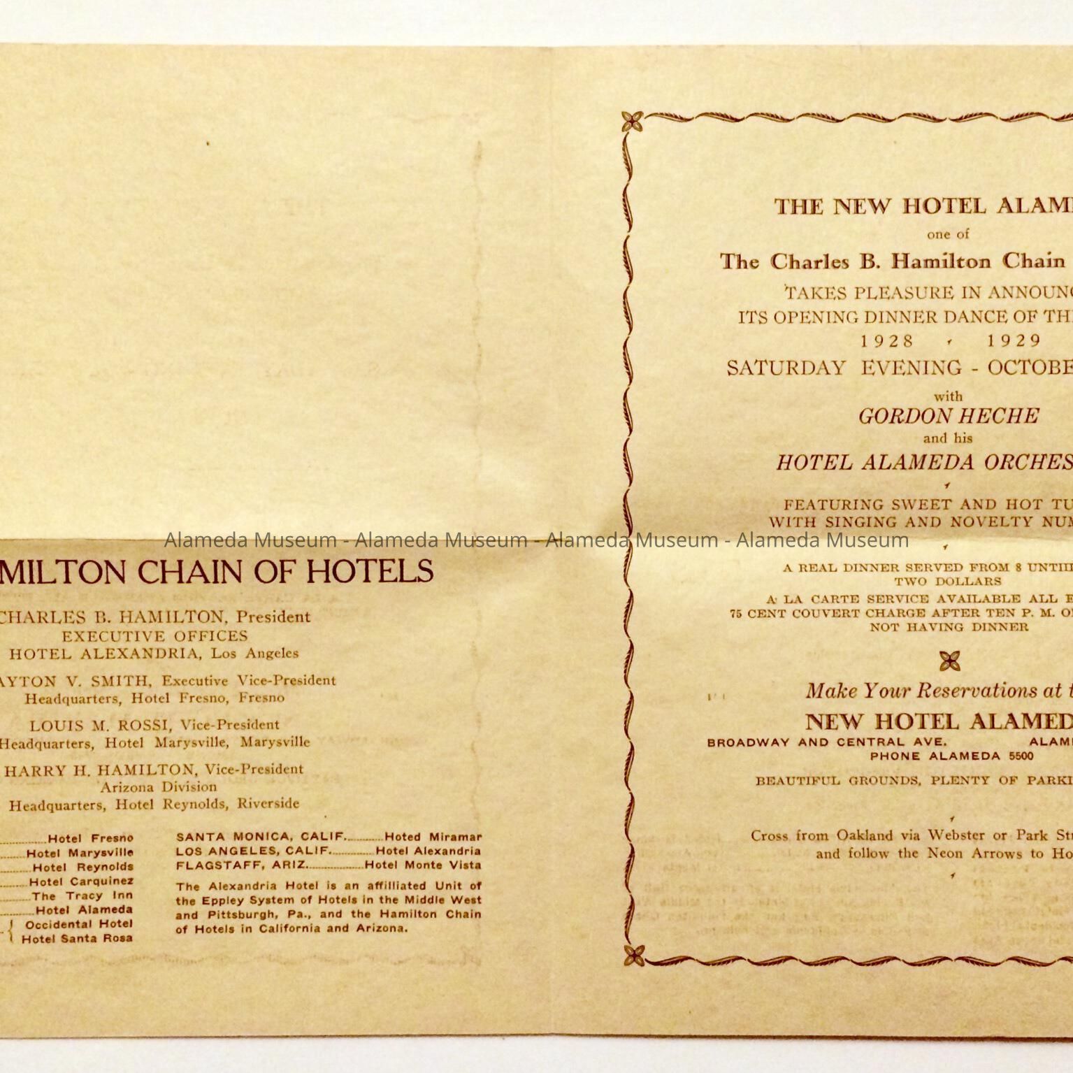 Flyer 'The New Hotel Alameda', for opening dinner dance, 1928-1929Entry/Object ID