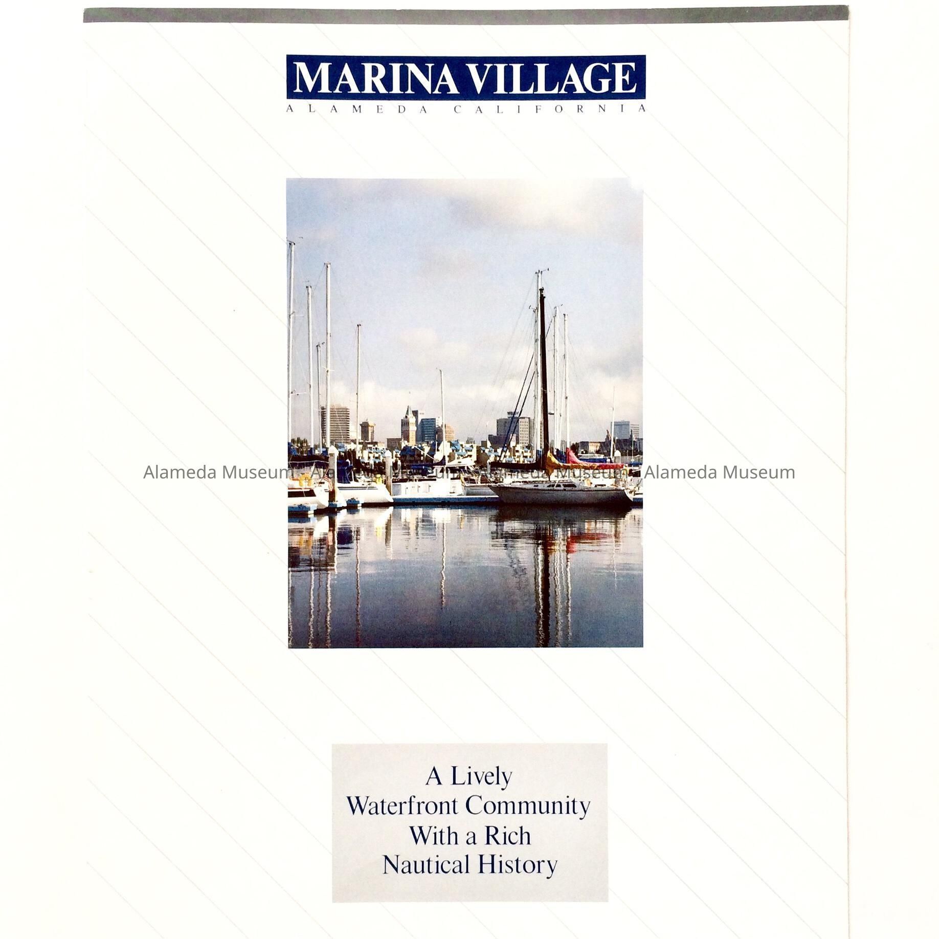 2 page advertising flyer with illustrated cover depicting sailboats on the Alameda Estuary (color) & bold caption "Marina Village."