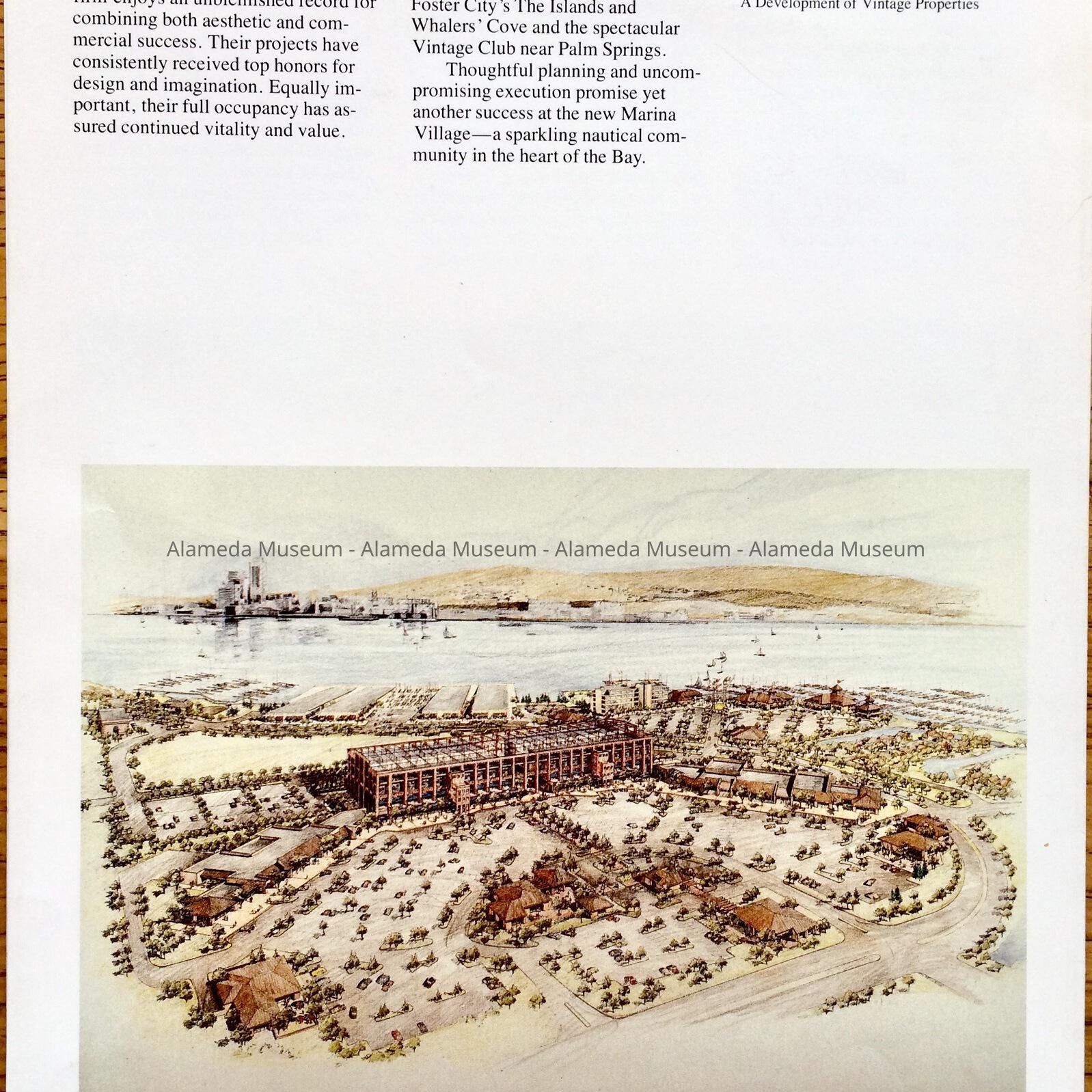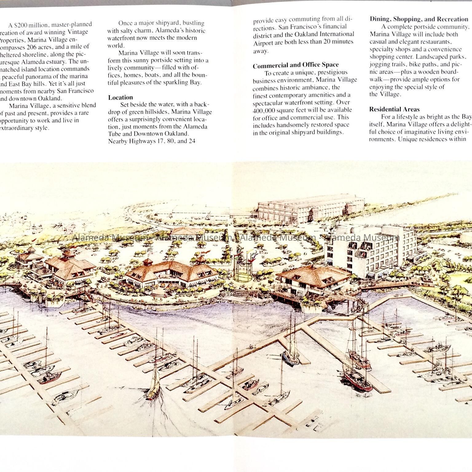 History of Object: Advertising flyer representing Marina Village (Vintage Properties) and their proposed designs incorporating the old Bethlehem Ship Building (erected 1916-17) which was demolished in 1985.