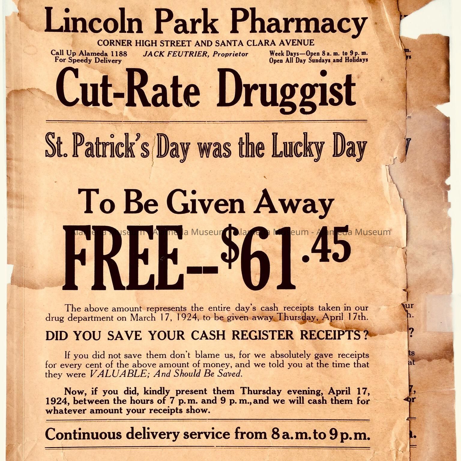 HISTORY OF OBJECTS: FLYERS ISSUED BY THE LINCOLN PARK PHARMACY, CORNER OF HIGH STREET AND SANTA CLARA AVENUE, ALAMEDA, CALIFORNIA. FLYERS CONCERN A SAINT PATRICK'S DAY CONTEST, WITH A PRIZE OF $61.45. PRIZE WAS TO BE AWARDED TO A LUCKY CUSTOMER.