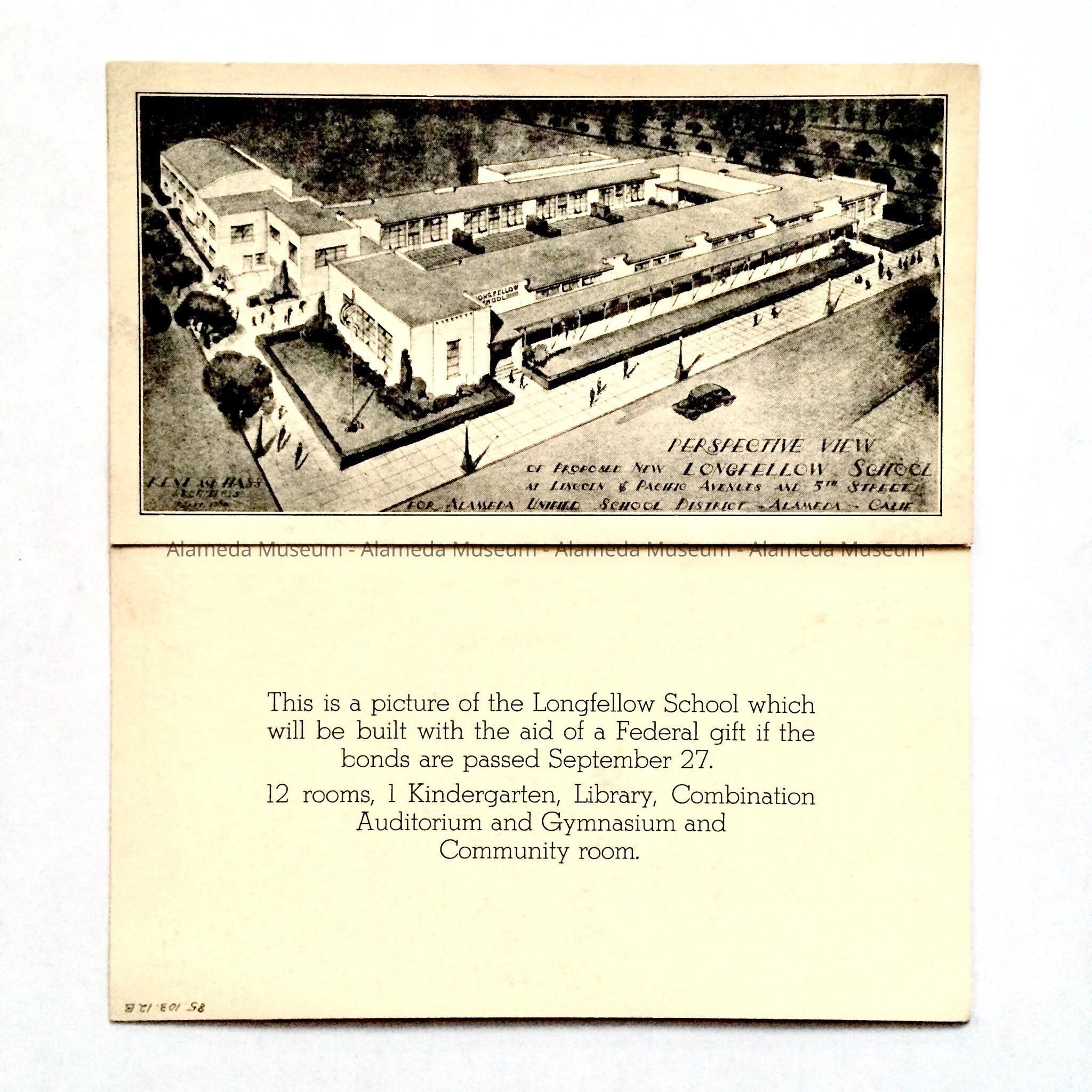 Illustrated flyer on heavy paper with caption "Perspective View of Proposed New Longfellow School." On the reverse side printed information concerning school.