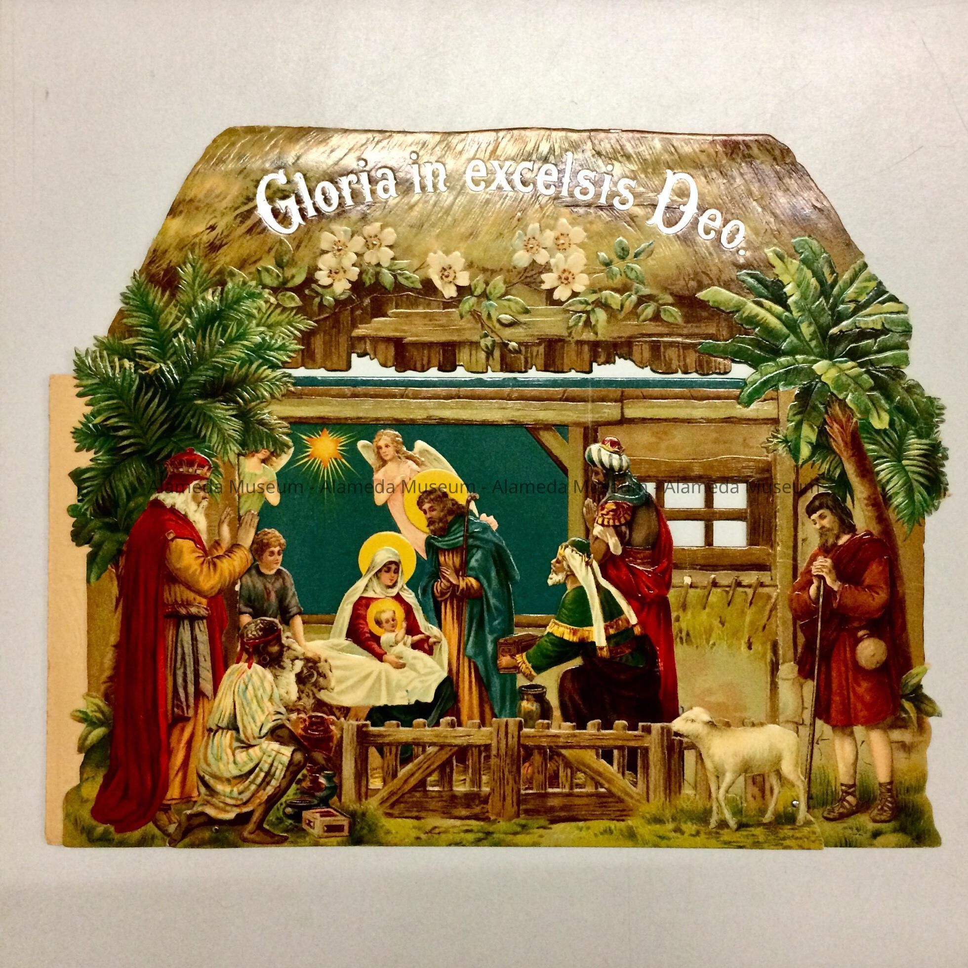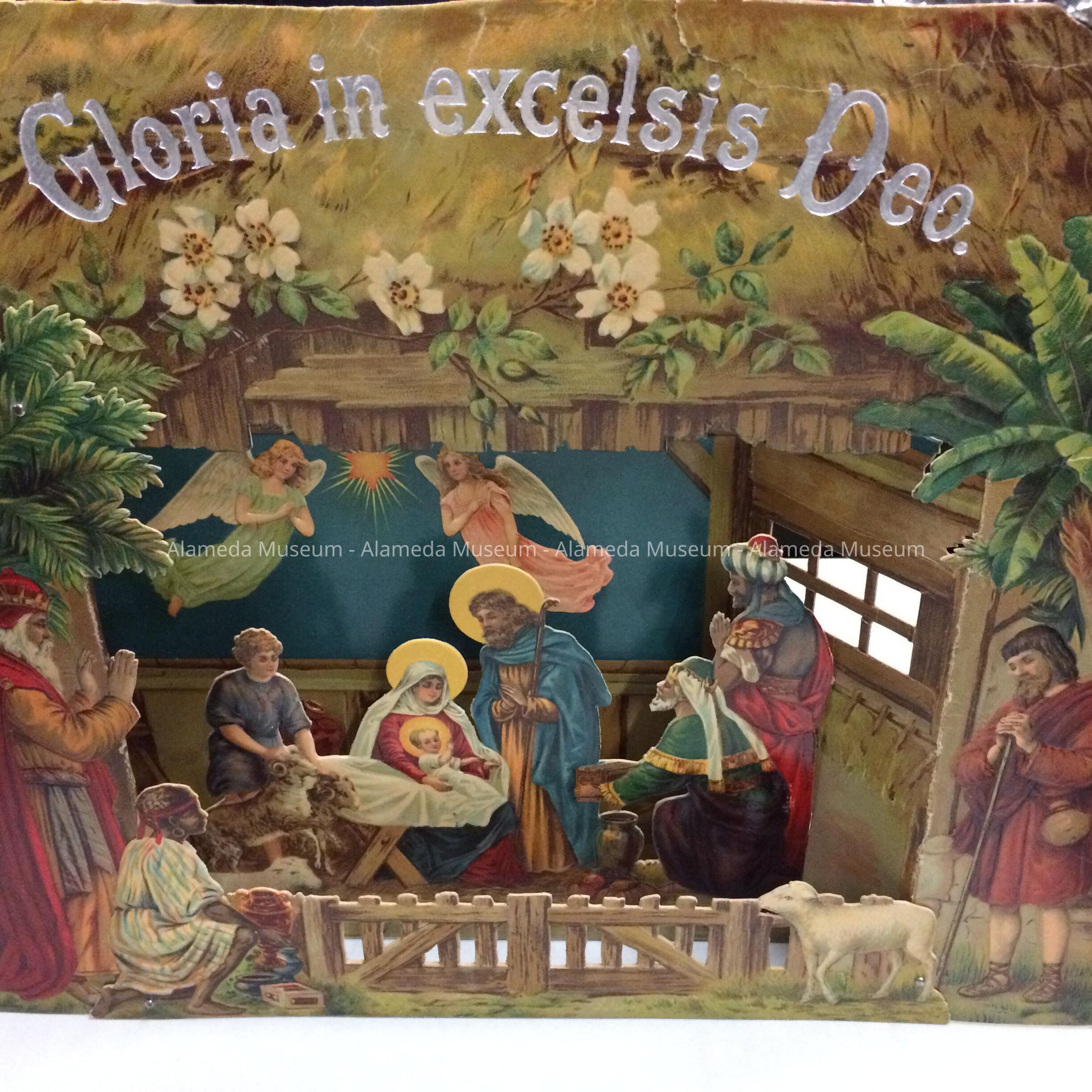 Description: Printed cut-out cardboard traditional creche scene featuring the holy family, the three kings, a shepherd or two and sheep, angels, a star, and what may be an African slave, in a thatched building. Creche folds out for 3-dimensional effect, kept together with 3 pot metal split pins. In the thatch is imprinted in silver type: 'Gloria in excelsis Deo.' No printer's identification.
