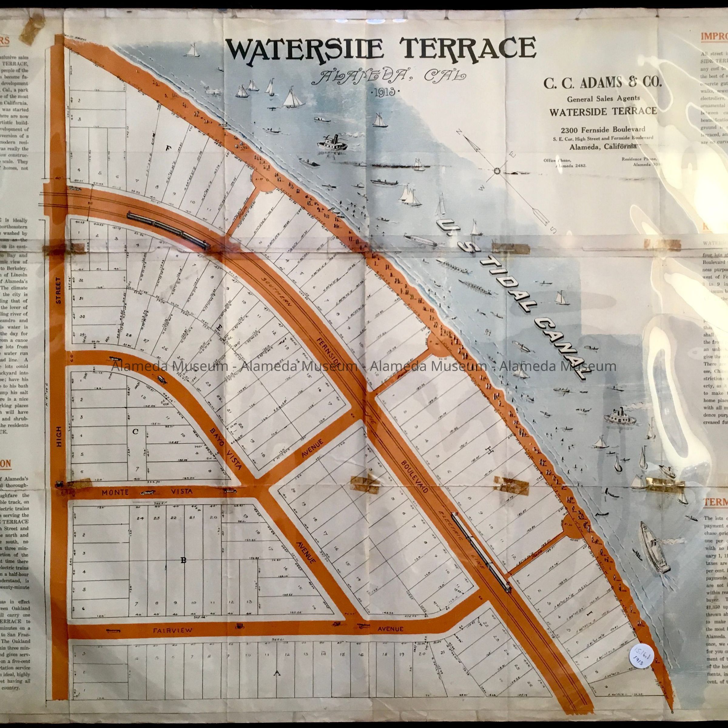 HISTORY OF OBJECT: A MAP THAT IS PRINTED ON BOTH SIDES AND INCLUDES AN ILLUSTRATION OF A HOUSE ON BUENA VISTA AVENUE AND A MAP OF THE ENTIRE ISLAND OF ALAMEDA IN BLUE AND ORANGE COLORED TYPE ON AN OFF WHITE COLORED BACKGROUND. A SUBDIVISION MAP FOR THE OPENING AND SALE OF PROPERTY IN THE WATERSIDE TERRACE DISTRICT, WHICH INCLUDES THE BOUNDARIES OF HIGH STREET, FAIRVIEW, AND FERNSIDE BOULEVARD. THE MAP WAS PRODUCED BY C. C. ADAMS CO.
