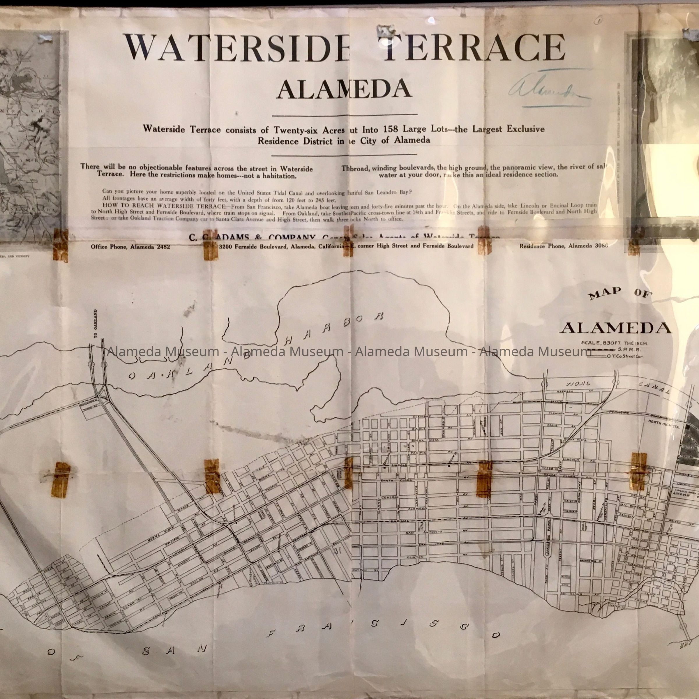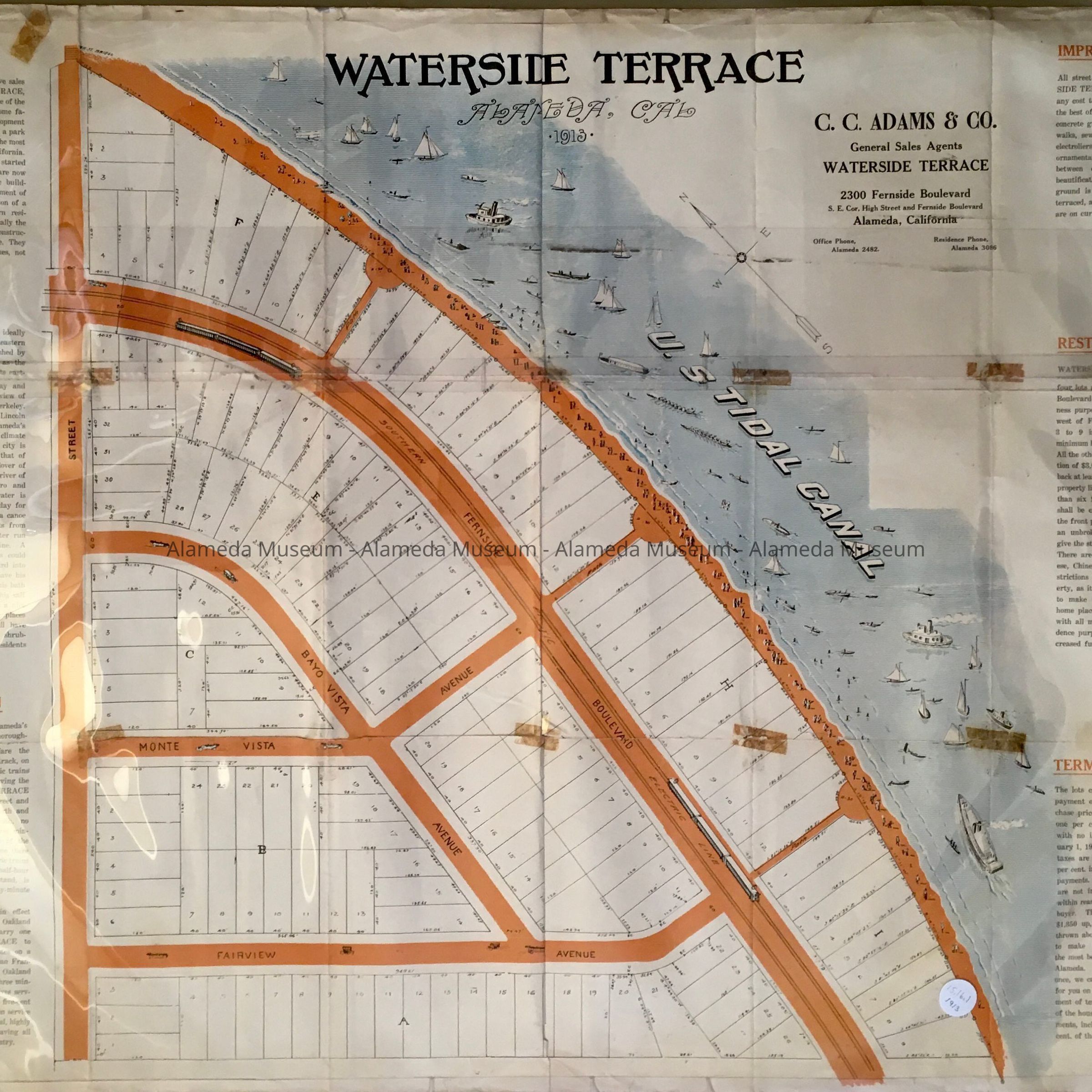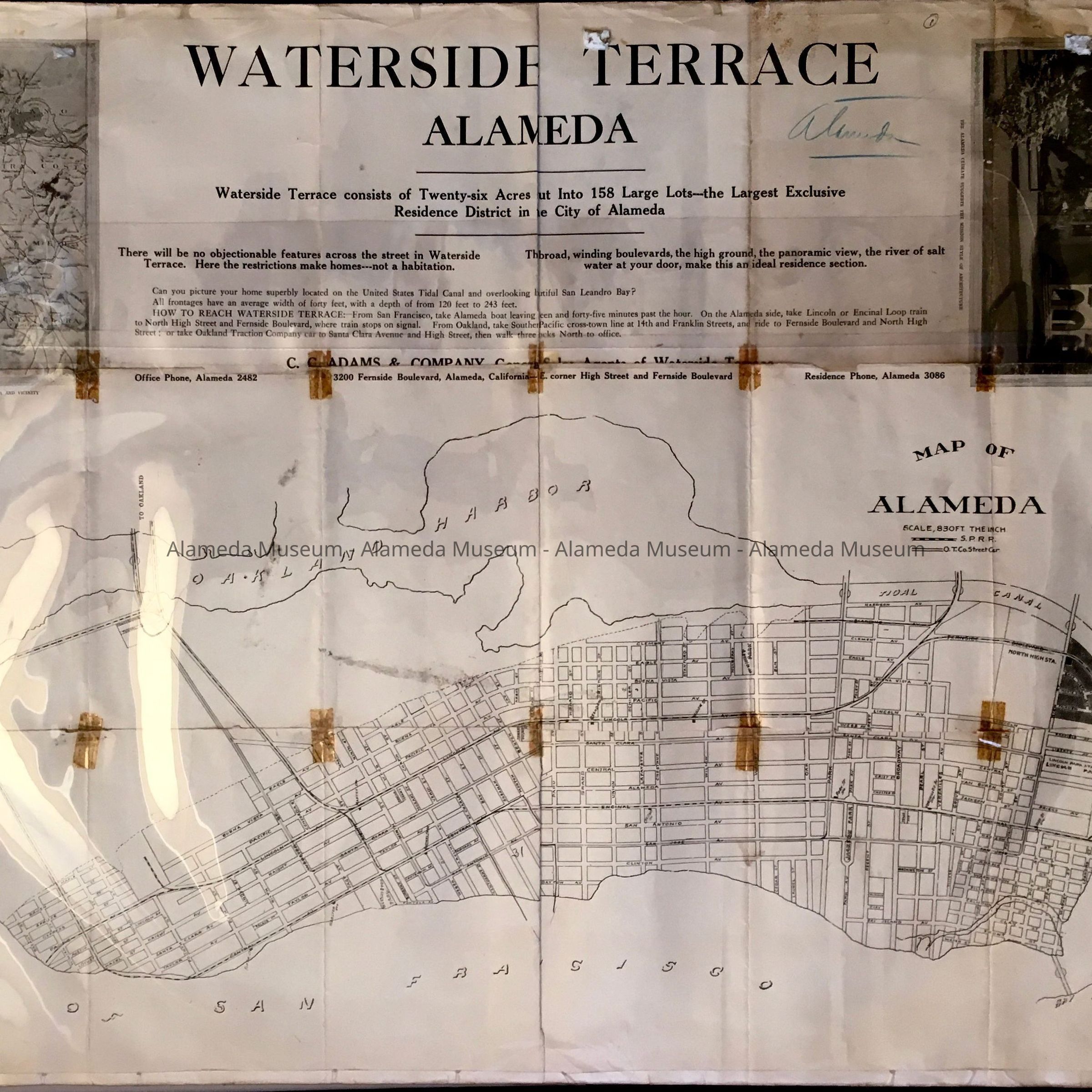DESCRIPTION: A FOLDED SUBDIVISION MAP WITH BOLD PRINTED CAPTION, "WATERSIDE TERRACE, ALAMEDA, CAL., 1913."