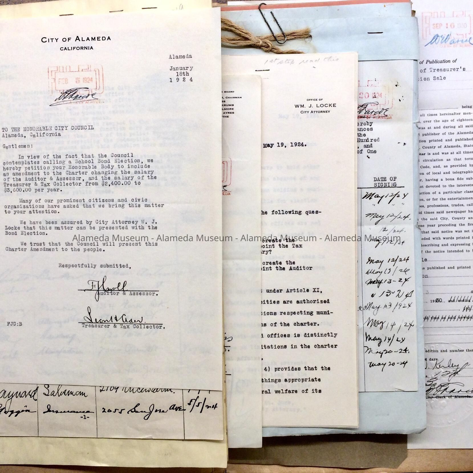 History of Object: Folder with documents found in the attic of City Hall in the 1990s. This folder pertains to the auditor's office; 1924 change of salary for Auditor F.J. Croll and Treasurer Leon Ader; 1924 petitions to create the office of a 'license collector', previously a task of the police, including one by the East End Non-Partisan Club; 1924 audit by Walter H. Cramer, CPA; 1928 vacation request of Leon Ader; 1924 increase of insurance against fraud; 1926 letter about a claim from the Strom Electrical Company; 1929 appointment of Henri A. Lewicki, and thereafter Harold E. Crabb to Deputy by City Treasurer Homer R. Dallas; 1930 special audit solicitation; 1930 Treasurer's Auction sale of Confiscated and un-claimed property
