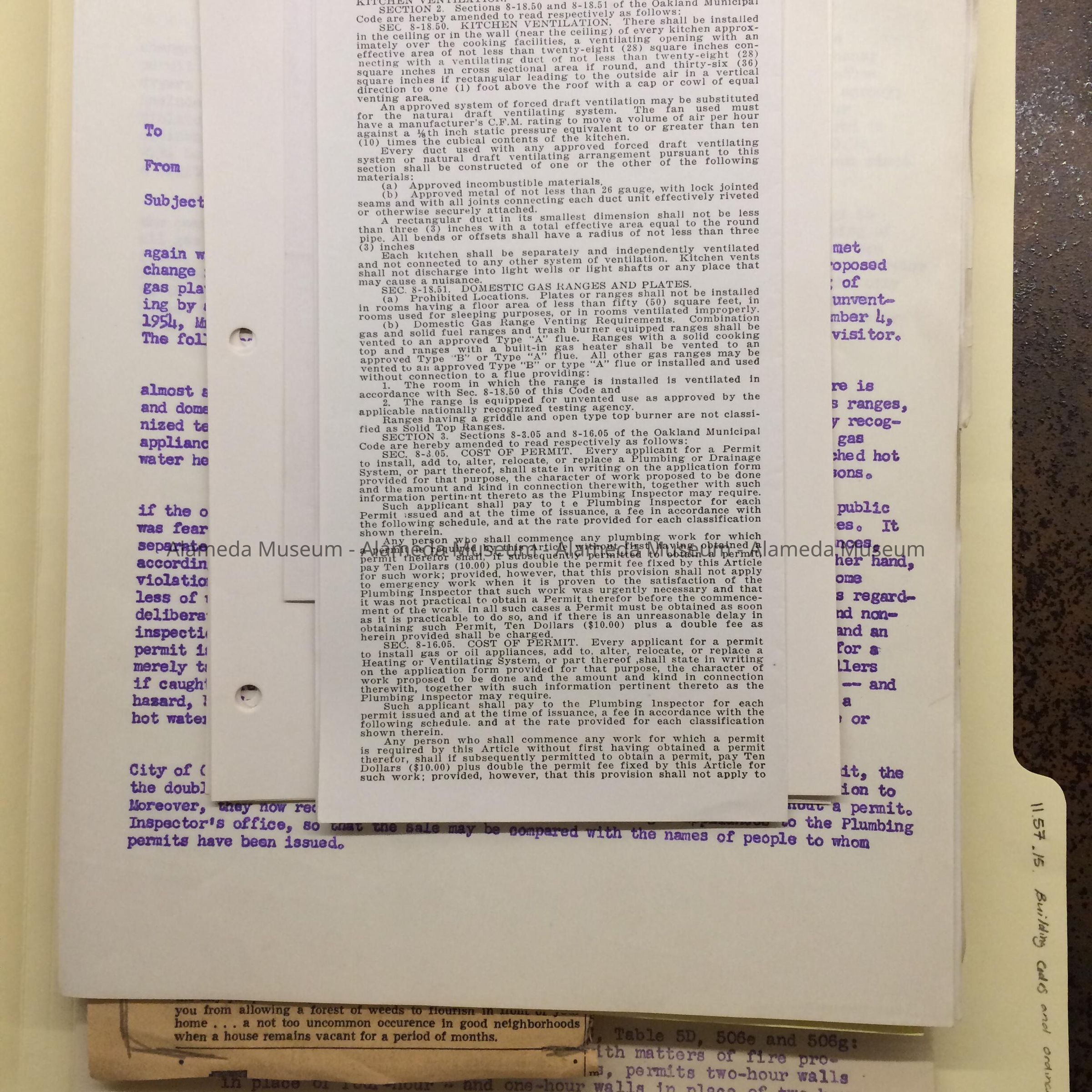 Documents found in City Hall attic during remodel in the 1990s, placed in a new folder after donation to the museum in 2011. Tab of original folder (now discarded) stated: "Departments - Buildings and Inspections (1950-1954)”. Documents pertain to building codes - ventilation and plumbing. Includes copy of ordinances, EBMUD suggested sewer and plumbing code, a summary of amendments to 1946 building codes, and individual nuisance proceedings.