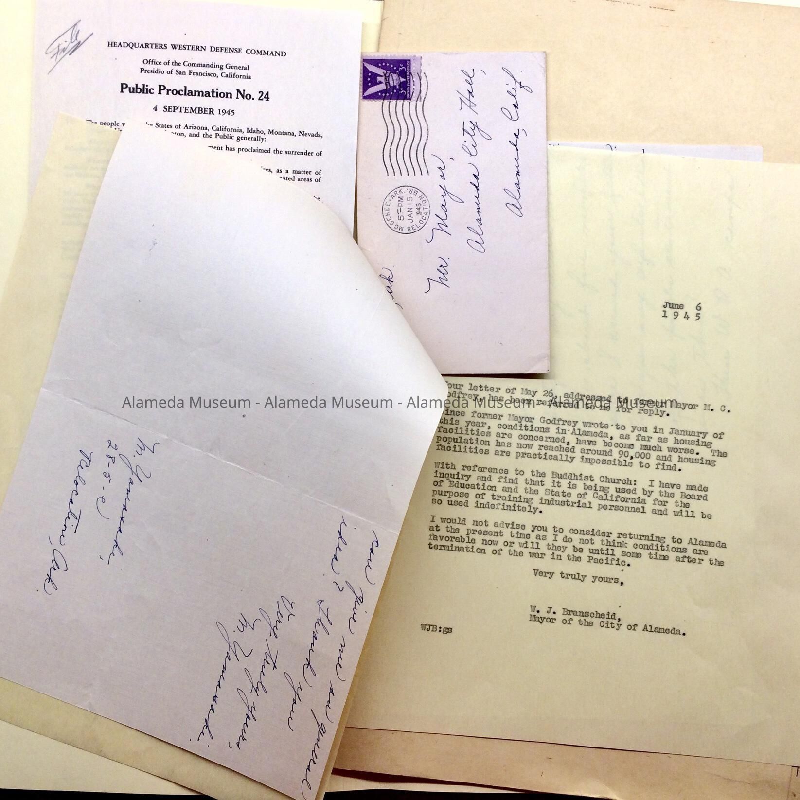 History of Object: Copy of Public Proclamation No. 24, September 1945, rescinding the ‘exclusion’, and two letters from Mr. M. Yamasaki, to the Mayor, first from January 1945 then May, asking opinion about returning to Alameda. Mayor Godfrey (January), and Mayor Braunscheid (June) discouraged Mr. Yamasaki, claiming difficulty in finding housing because of increase of population because of the military personnel. Also stating that the Buddhist Mission was indefinitely being used as training facility for industrial personnel, and suggesting the family wait until after the war.