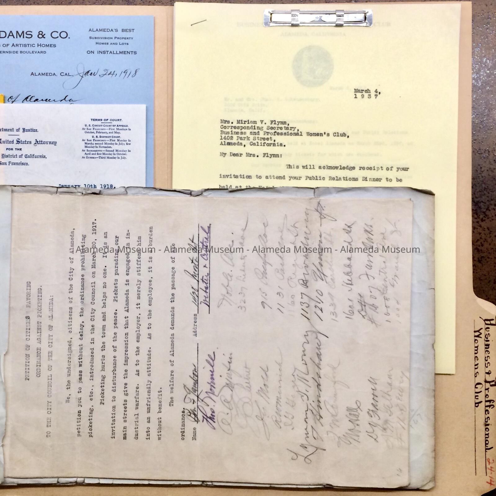 History of Object: Folder, found in City Hall attic, for 1933-1937 correspondence with the Business and Professional Women's Club, into which miscellaneous earlier documents have been inserted. Marked #2773, Petitions to prohibit picketing, 1917; #2857; US Attorney urging council to prohibit sale of liquor after certain hours, 1919; #2861 resignation C.C. Adams, exclusive sales agents waterside terrace and mastics park, 3200 Fernside, from Board of Library Trustees (1918); 1939 Hotel advertising pamphlet from Oakland Chamber of Commerce timed for Golden Gate Exposition (1939).