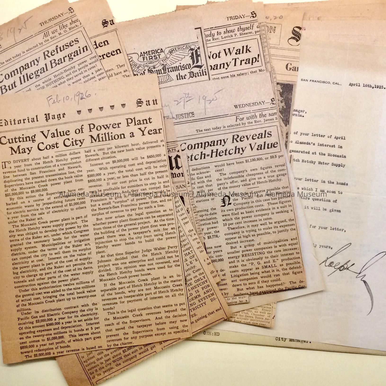 History of Object: Clippings and printed documents showing the City Manager, Mr. C. E. Hickock, and Mayor tried to secure power from San Francisco's Hetch Hetchy Moccasin Creek Hydro-power plant. However, the City already had an exclusive contract with the Great Western Power Company.