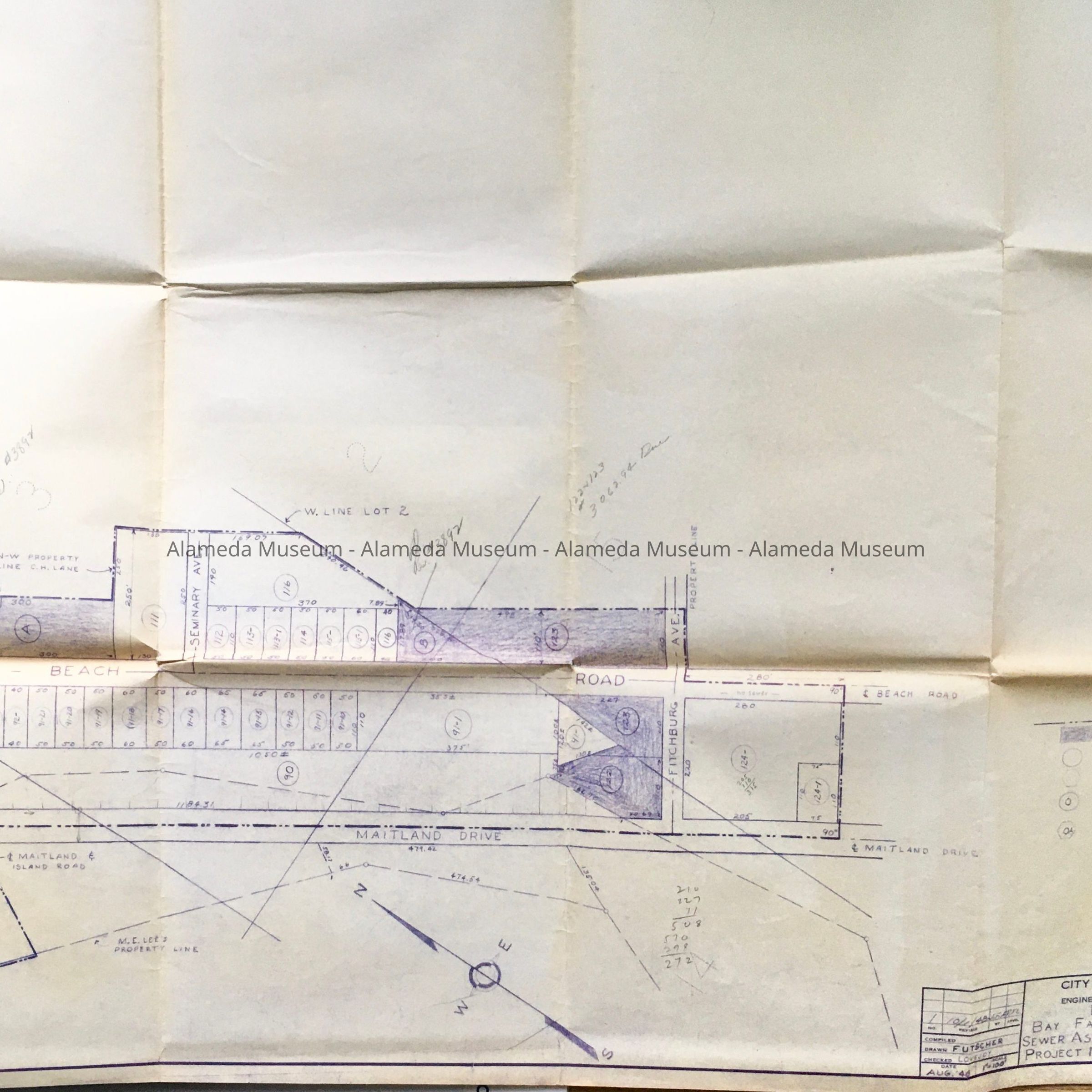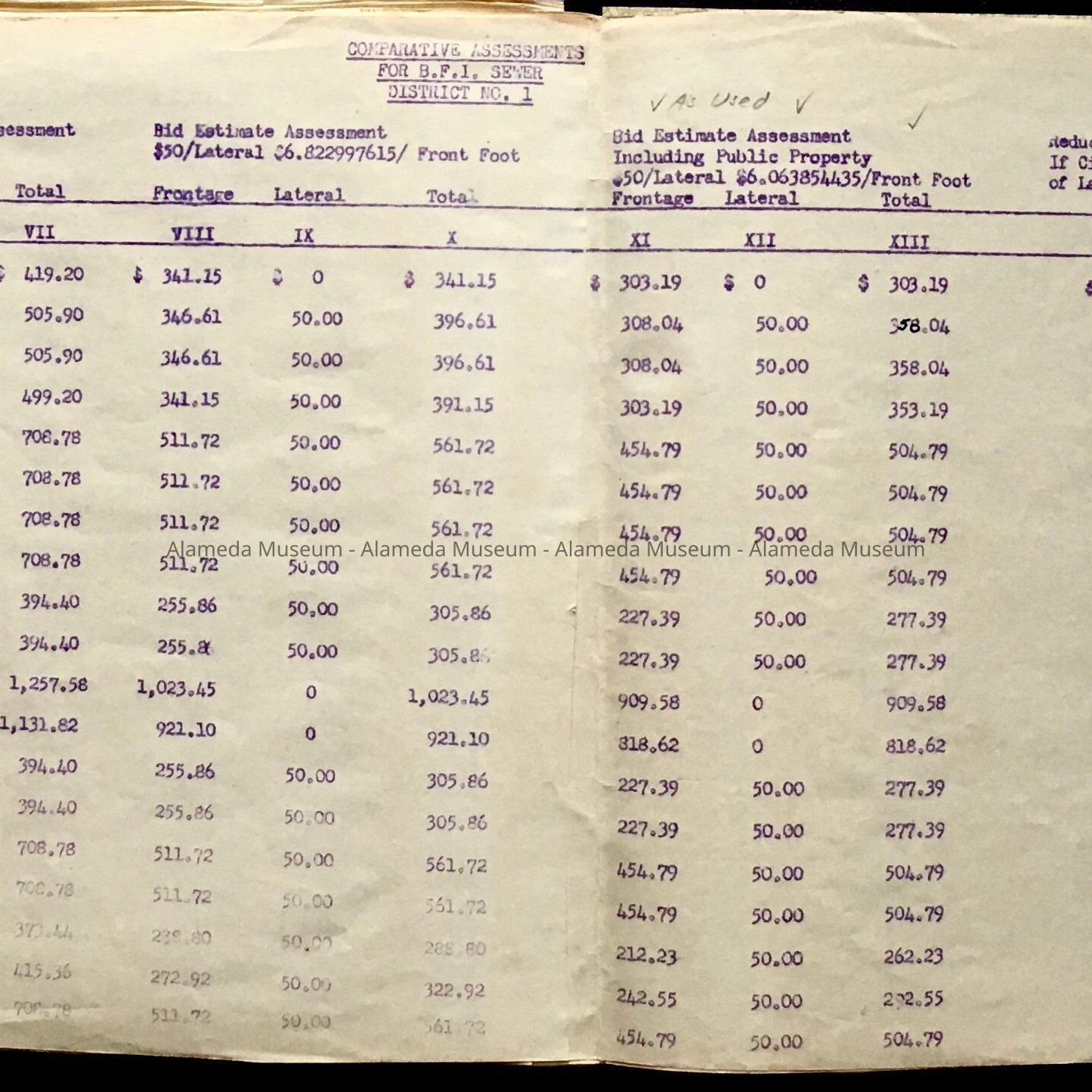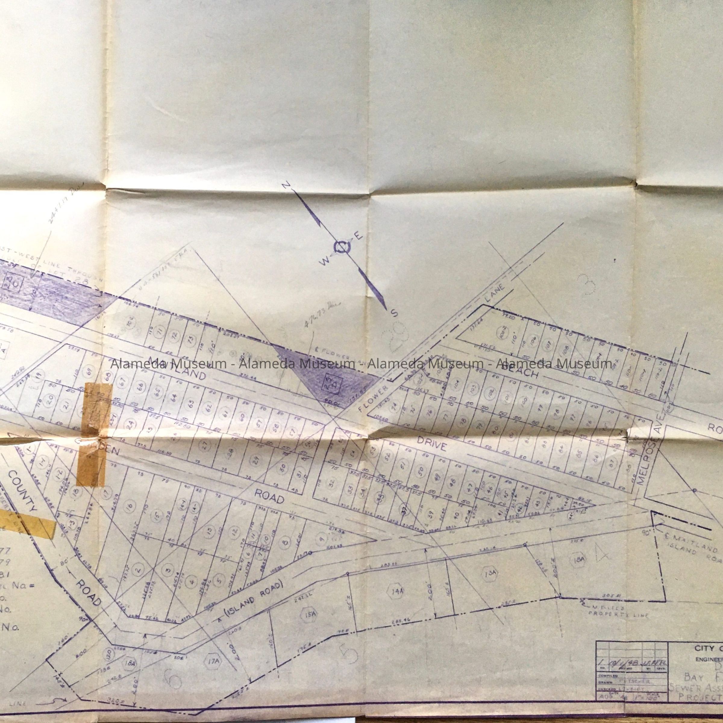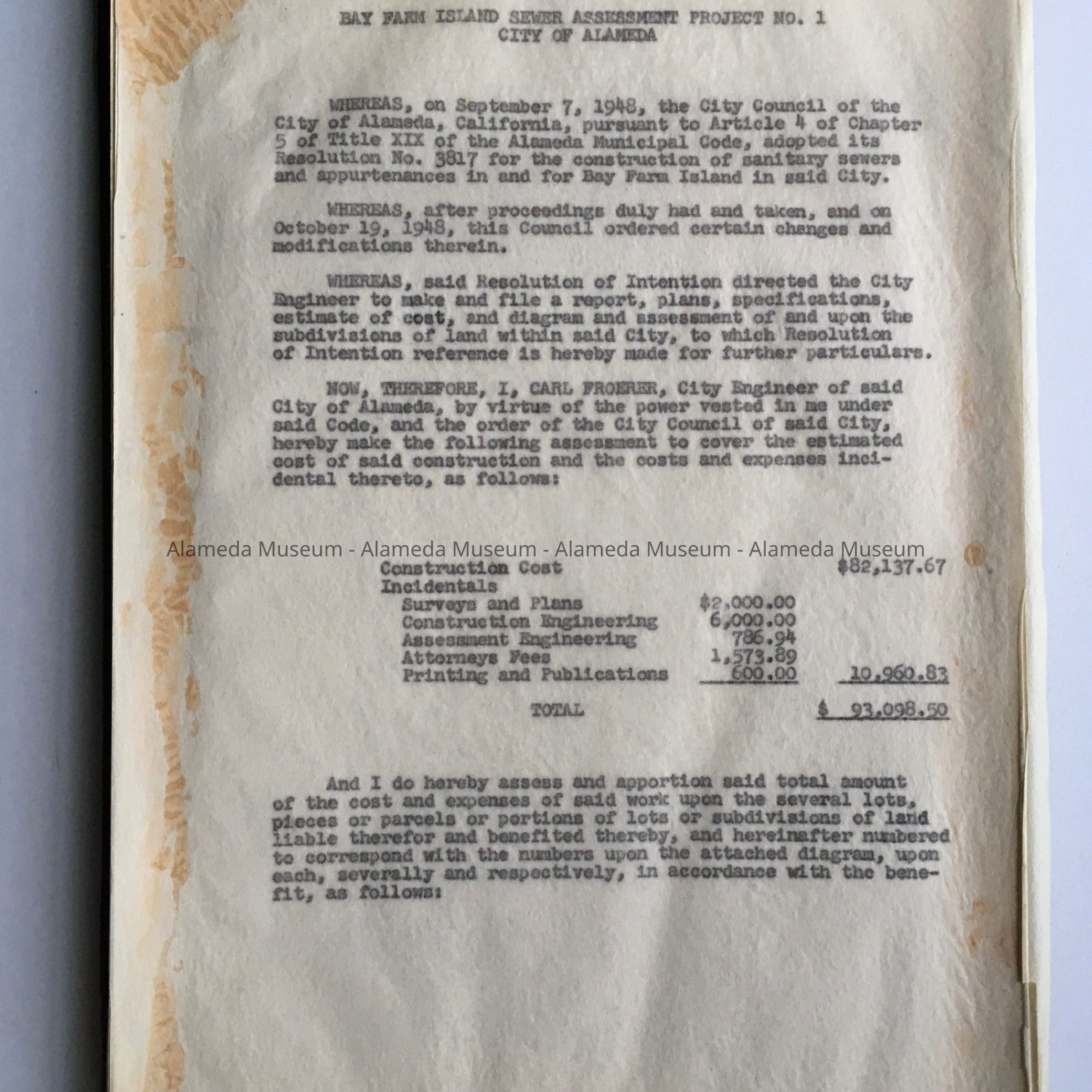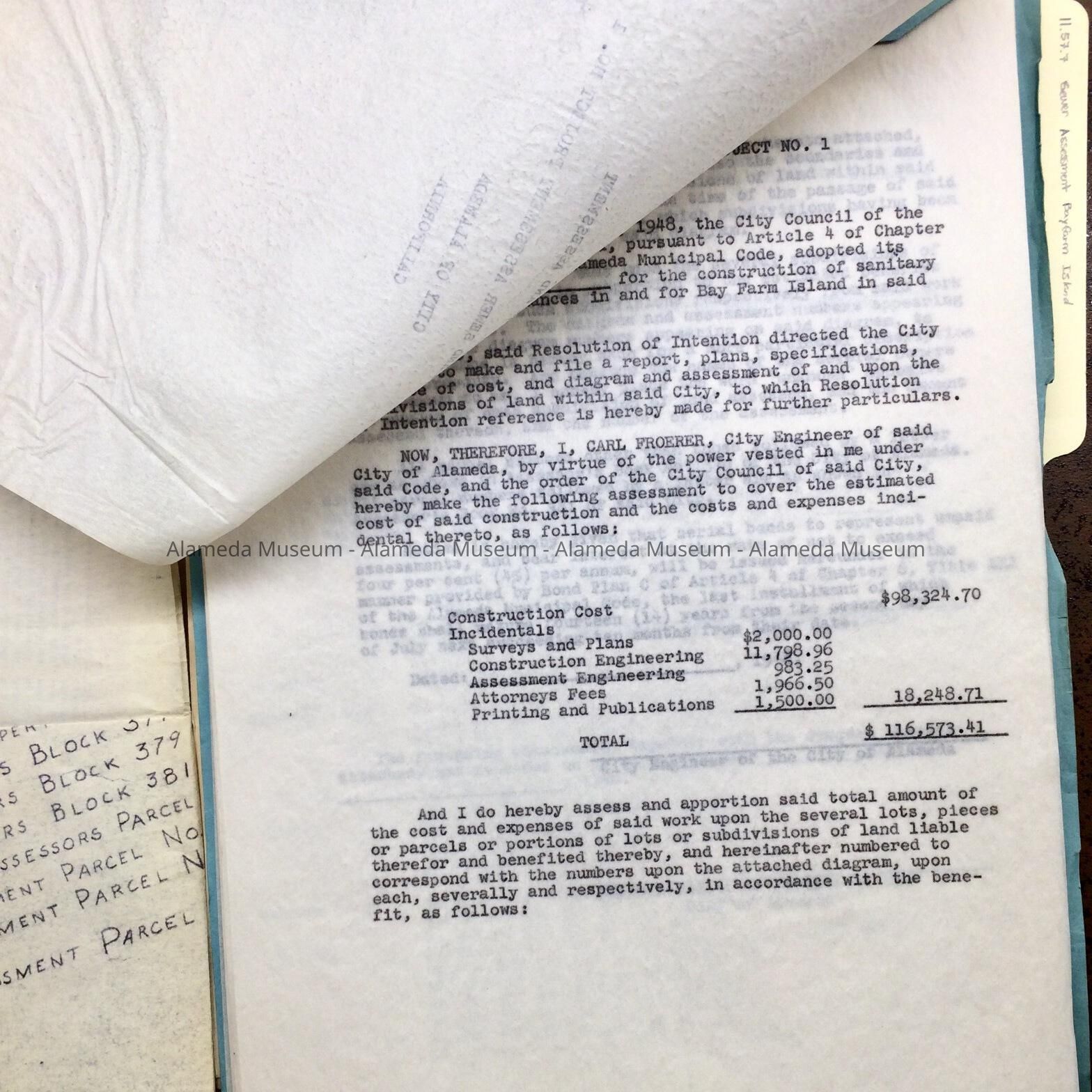 A: Documents found in City Hall attic during remodel in the 1990s, placed in a new folder after donation to the museum in 2011. Tab of original folder (now discarded) stated: Bay Farm Island - Assessment District sewers". Folder contains correspondence and reports on sewers for Bay Farm Island. Includes assessments and plot map (including a map featuring street labelled ‘St. Charles Street’).