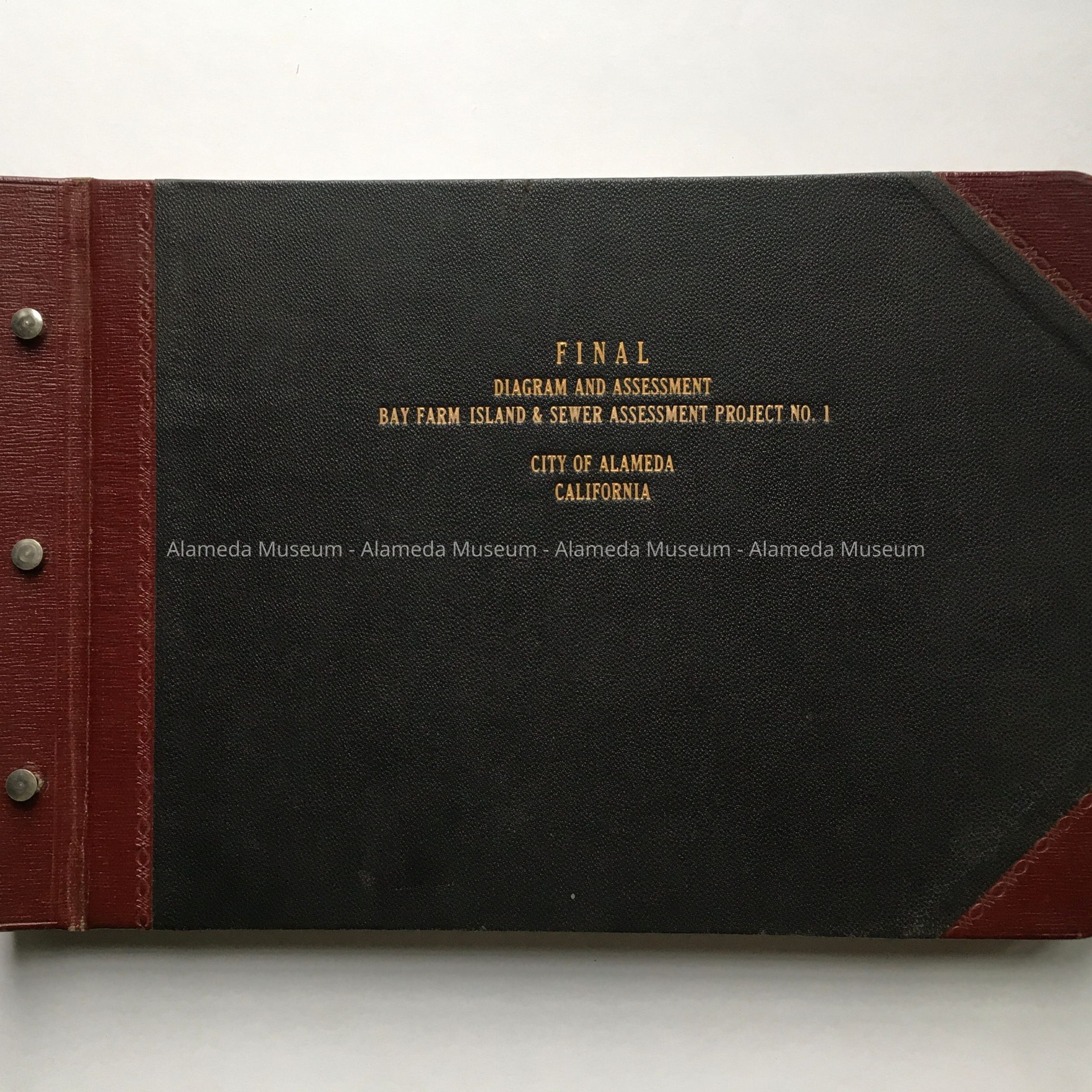 B: loose-leaf report bound with 3 metal screws and pins, with black buckram trimmed along collating edge and opposite corners with red leather-look plastic, titled ‘Final / Diagram and Assessment / Bay Farm Island & Sewer Assessment Project No. 1’