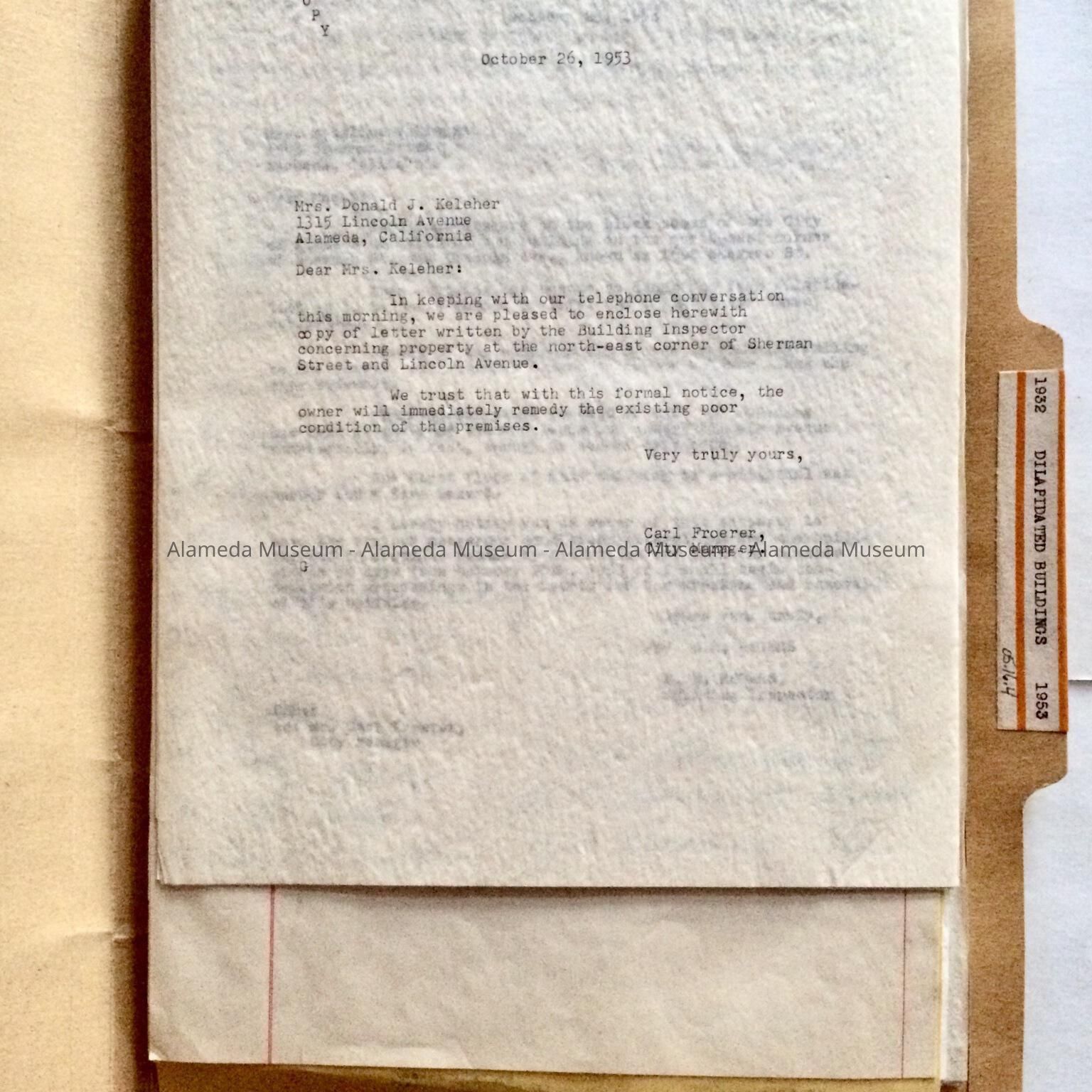 HISTORY OF OBJECT: A FILE CONTAINING CORRESPONDENCE AND PETITIONS CONCERNING NEGLECTED PROPERTIES IN THE CITY OF ALAMEDA. THE FILE ALSO INCLUDES NOTICES TO ABATE NUISANCES CHICH WERE POSTED IN FRONT OF VARIOUS STRUCTURES. ALSO INCLUDED ARE SIGNED PETITIONS OF PROPERTY OWNERS IN THE VICINITY OF THOSE BUILDINGS.