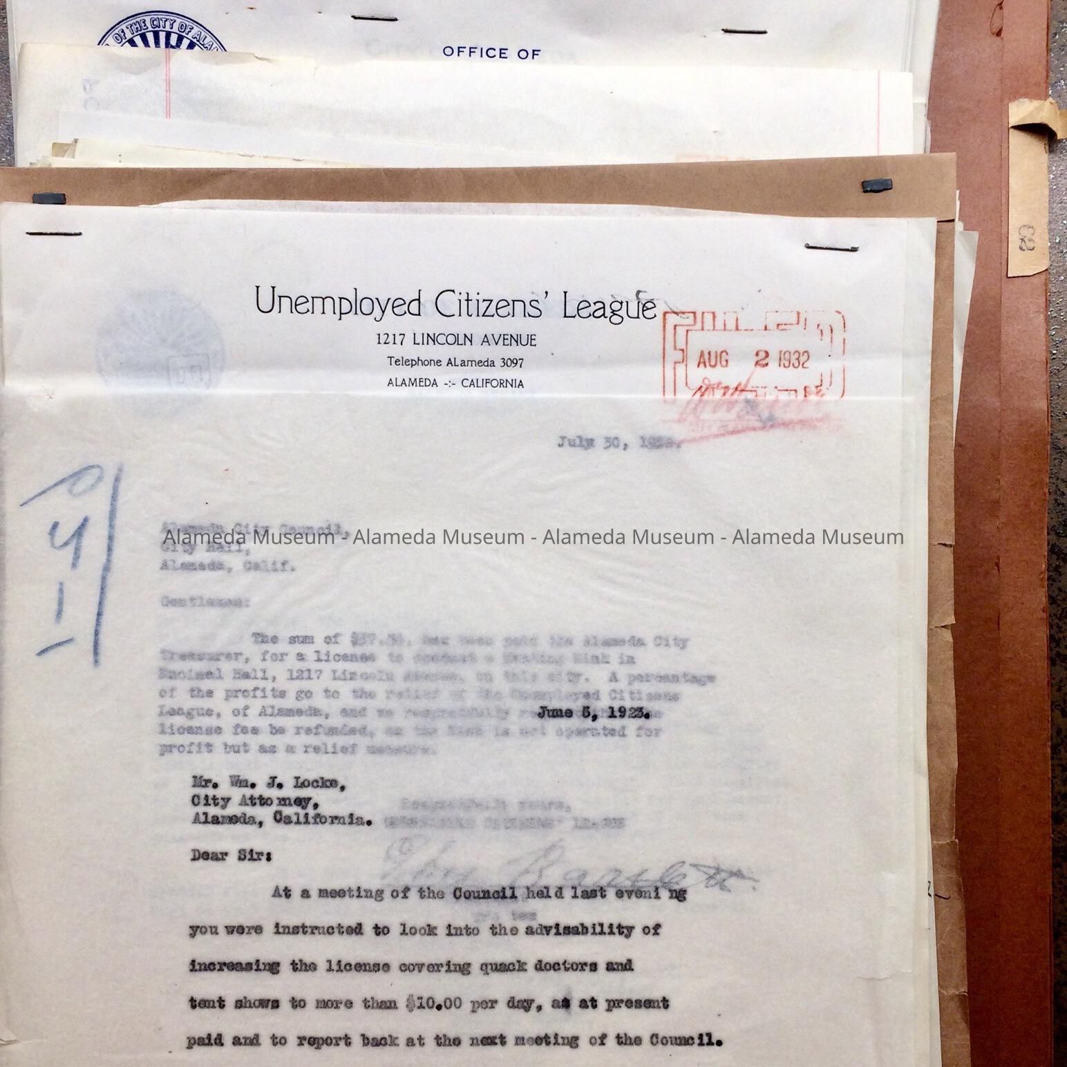 History of Object: Expanding Folder, found in the attic of City Hall prior to renovations in the 1990s. Documents in this ‘Pouch’ pertain to permits, predominantly to sell soft drinks, with many interesting business addresses, including a refusal for permit to the owner of the ‘Sugar-Bowl’ because of arrests (62-92), and violations of the Wright Act (62-92); protests against a yearly dyers and cleaners fee (62-126/127); and a letter from the Unemployed Citizens League, 1217 Lincoln Ave, about permit for a Skating Rink (62-129), and plans to increase license fee for quack doctors (62-1)