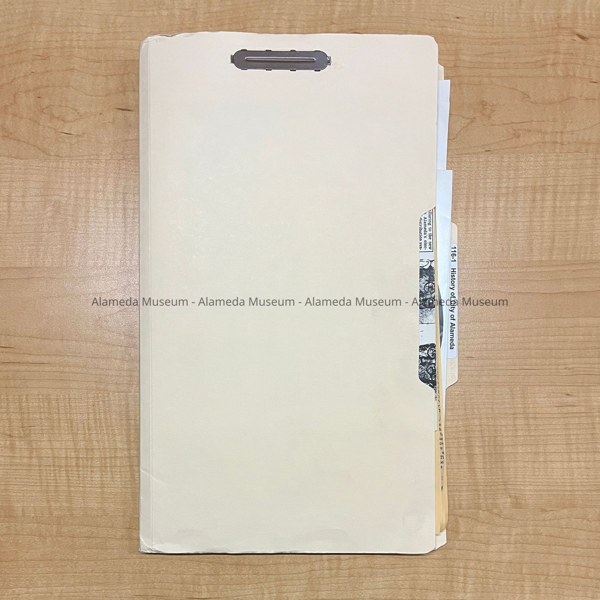 Description: Legal size manila folder, with on tab: '116-1 History of City of Alameda'. Many papers are two-hole punched at the top, and gathered with metal clips, with additional ungathered papers, or papers gathered with paper clips.