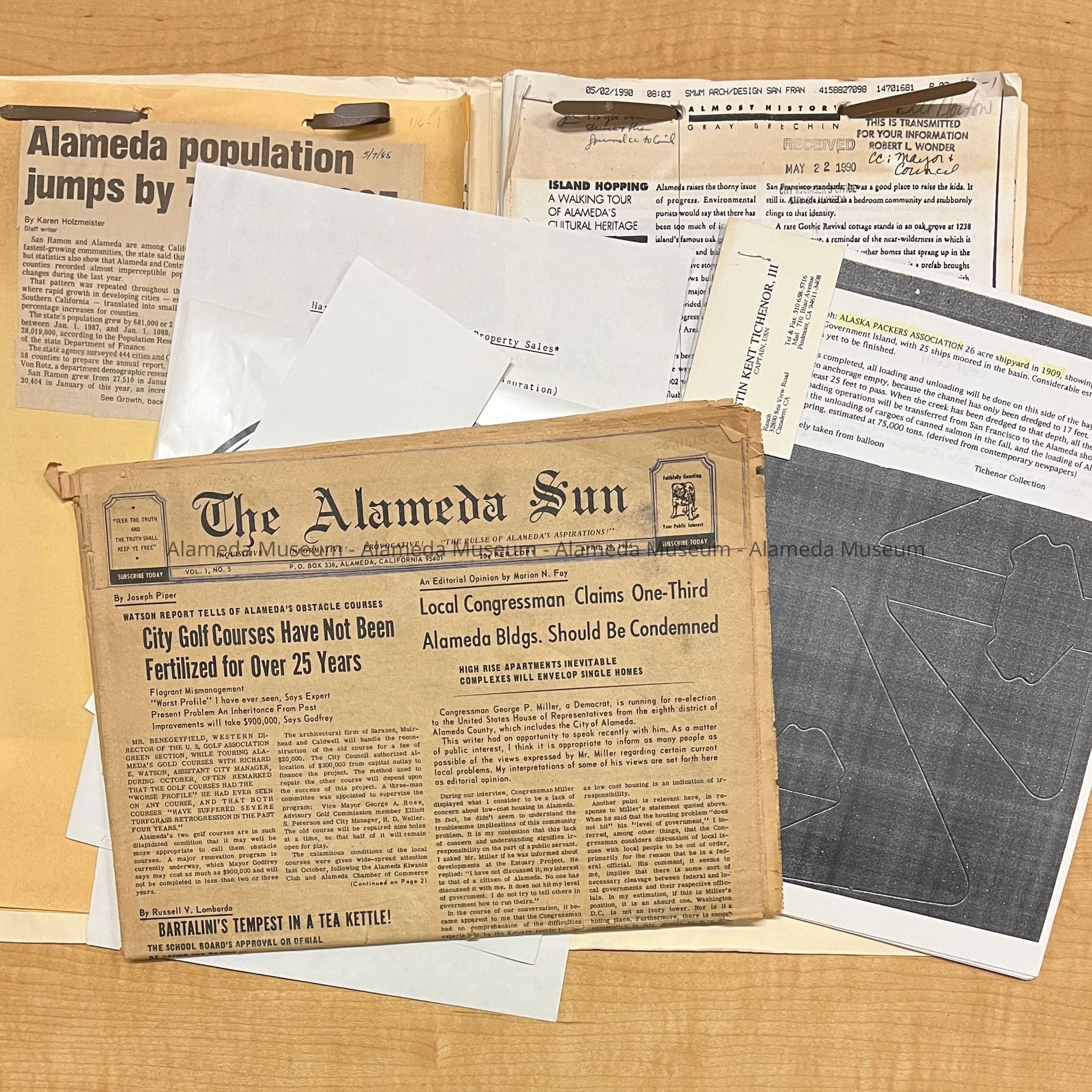 History of Object: Folder with papers relating to the history of Alameda. Papers appear to be having overviews of the history used in articles or speeches; in addition, a copy of 'The Alameda Sun', Vol. 1, No. 5, April 28, 1966,; copies on shiny paper of various sizes of the City Seal; paper relating to Alameda Retail Sales trends 1984-1986; Harbor Bay Isle Residential Property Sales (1 page); history of Alameda Packers, including a full list of ships, apparently in relation to a photo that hung at City Hall; clippings and copies of history articles; photos and correspondence relating to lamps designed by Timothy L. Pflueger, from the Alameda Theatre that were on display in an Art-Deco exhibit at the Renwick Gallery of the National Museum of American Art, Smithsonian (and were cleaned by that organization's staff).
