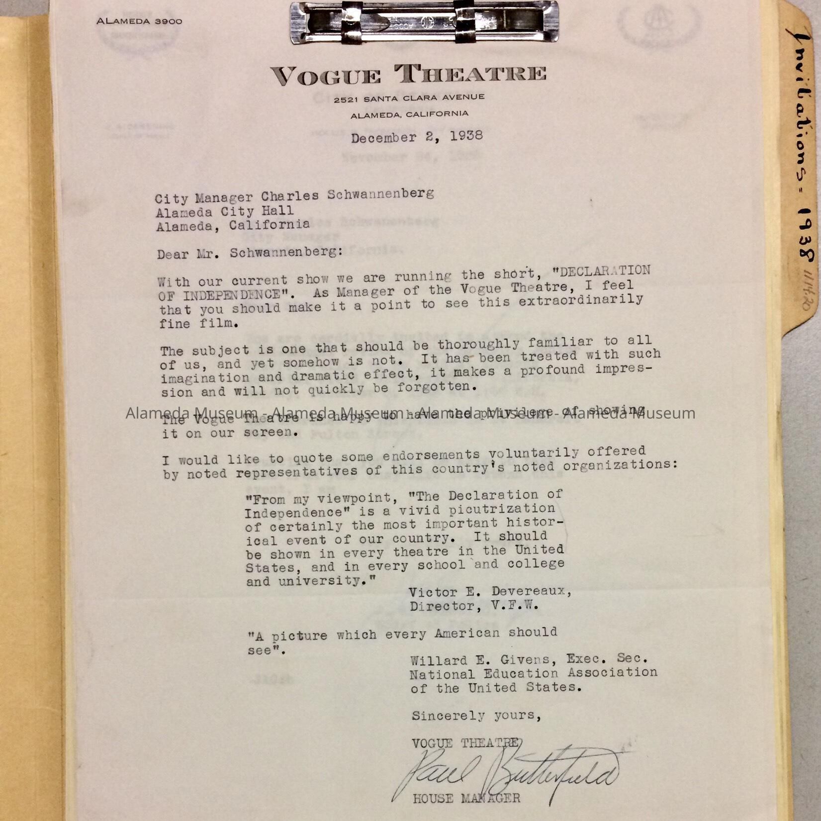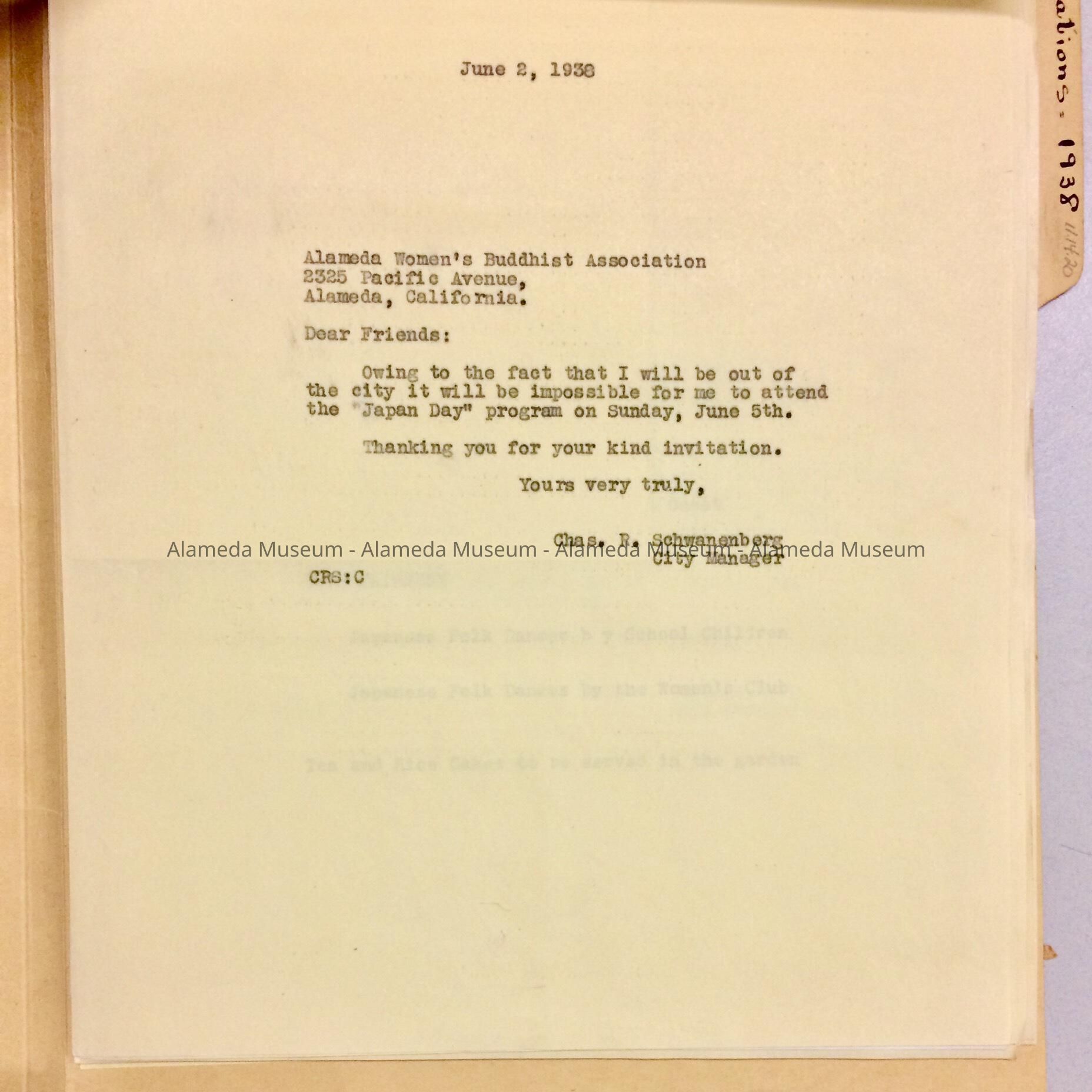 Folder 'Invitations 1938' to City representatives to events around CaliforniaEntry/Object ID