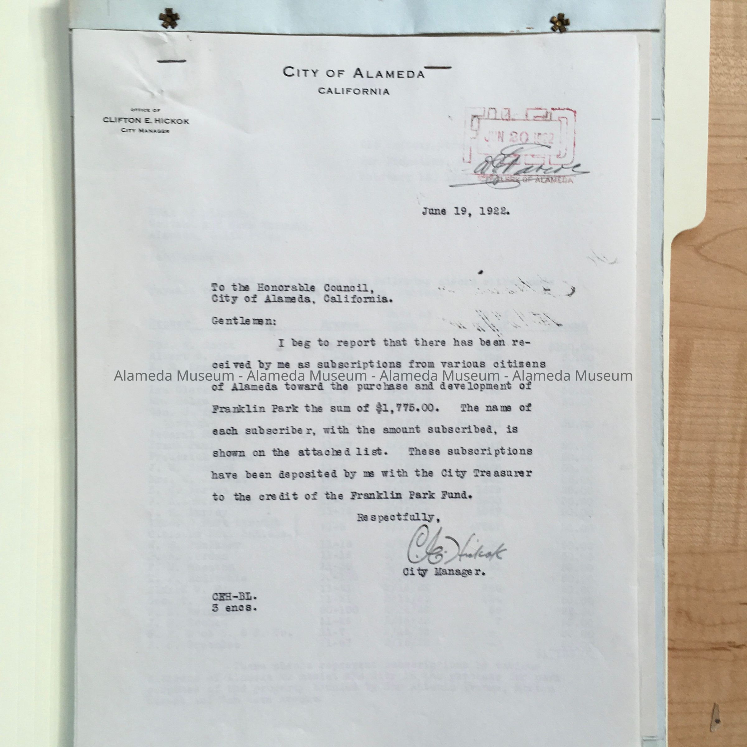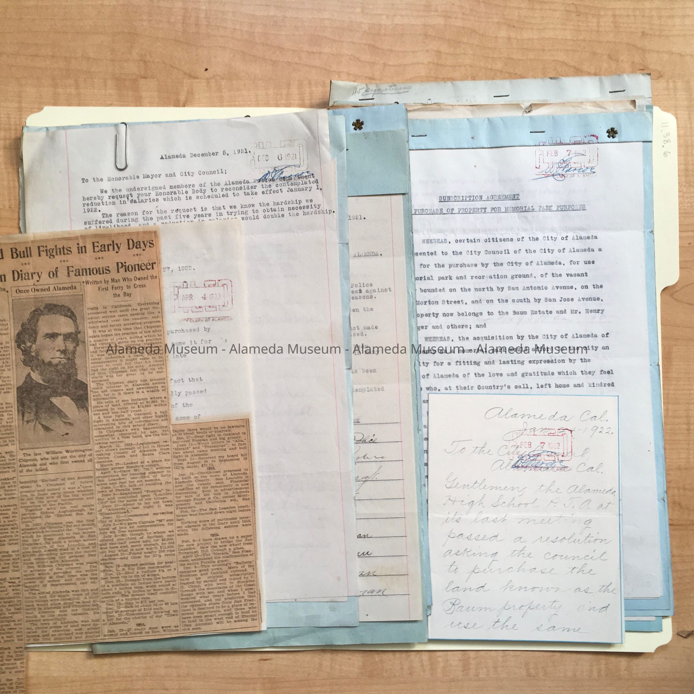 History of Object: Miscellaneous city documents. Documents relating to parks including letter asking to name park after Chipman (3096-4) and another letter mentioning Tilden playing tennis as an 8 year old. Documents about creating a park out of Landsberger & Baum properties. Franklin park (3096-7 & 3096-8).