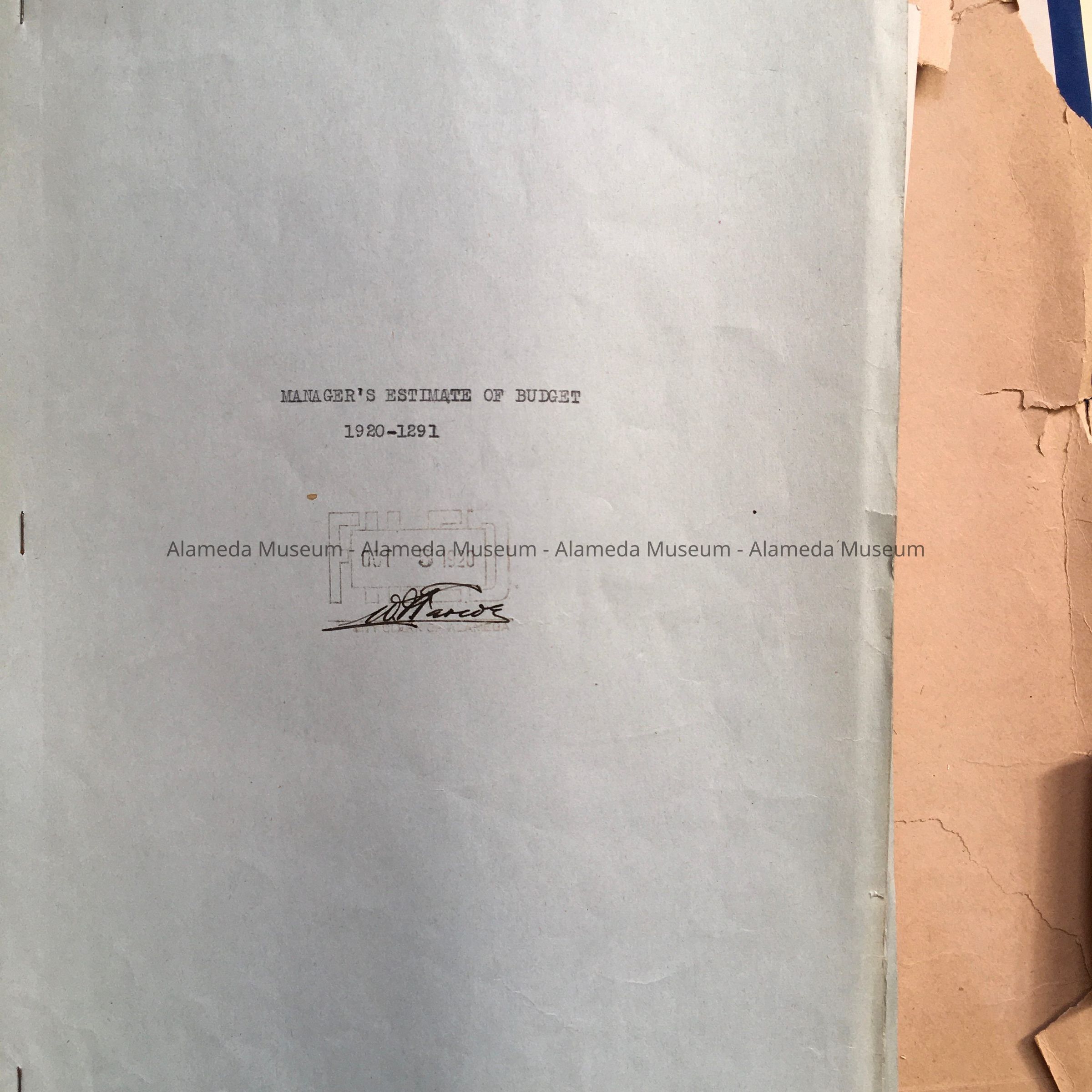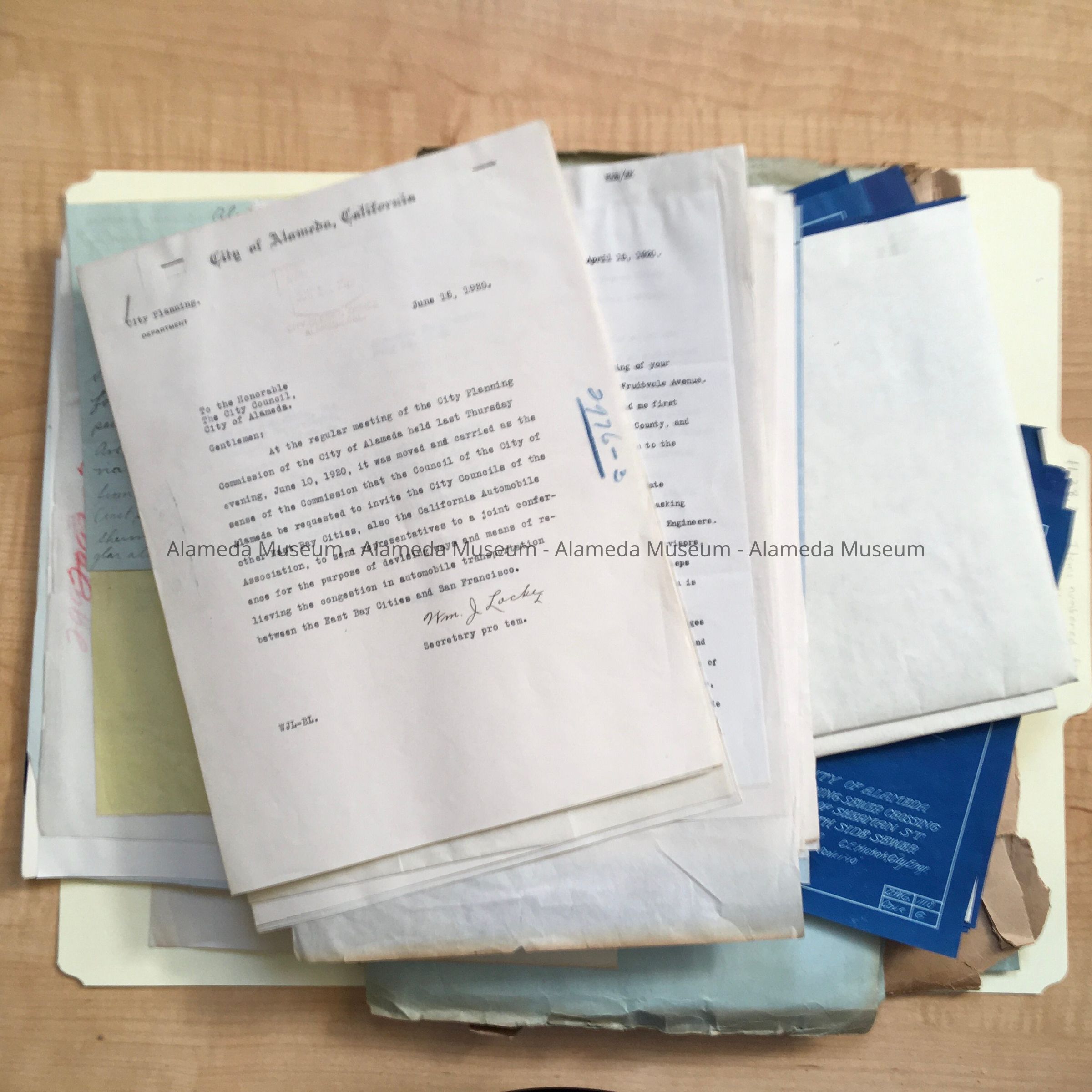 History of Object: Miscellaneous documents including E. H. Hart business card (2976-1), Fruitvale drawbridge (2998-1), waterlines for fire protection (2997), tidelands lease, including map of ownership (2982), 1921 budget (2999- 1 & 2), blueprints for sewer system in envelope.