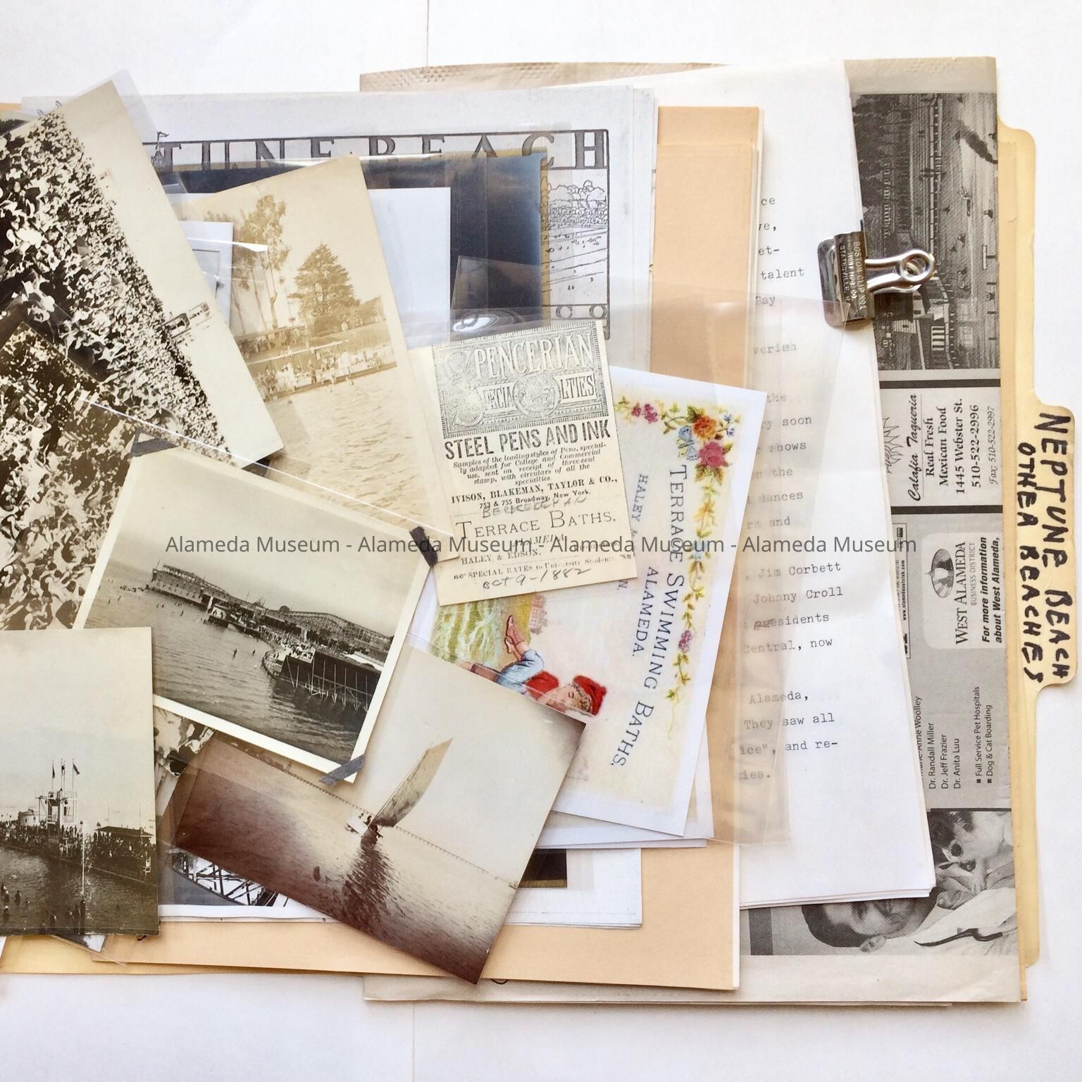 History of Object: Folder with information about Alameda Beaches, in particular Neptune Beach. Assumed to be from the collection of Archie Waterbury.