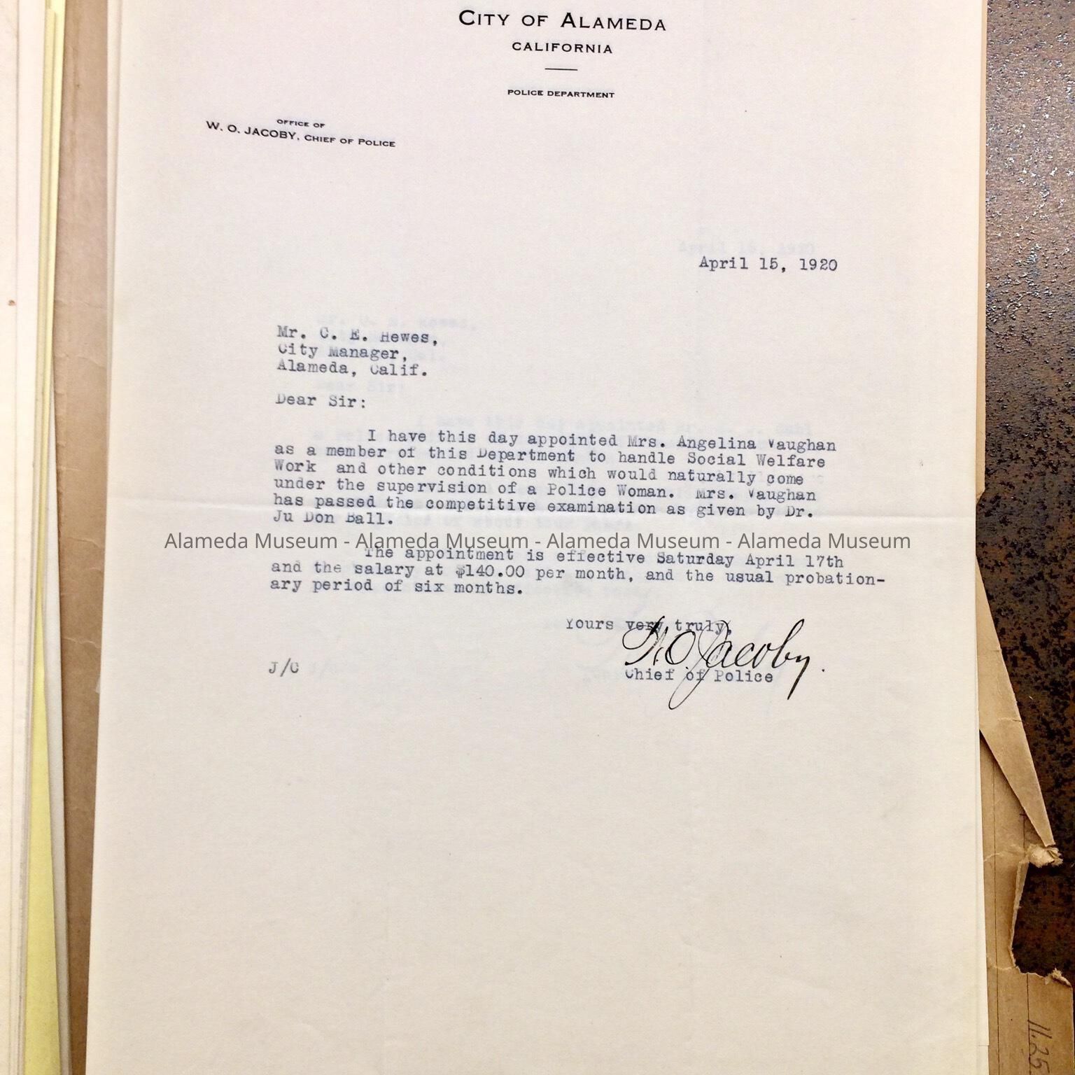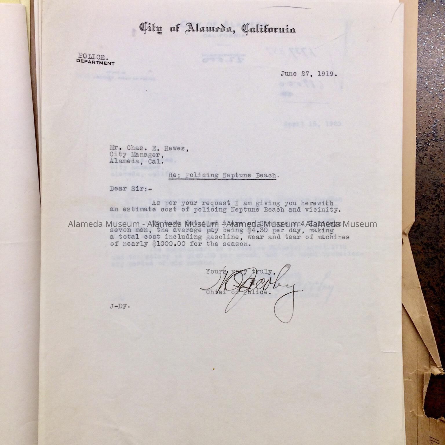 A FILE FOLDER CONTAINING COPIES OF CORRESPONDENCE, ETC. CONCERNING THE ALAMEDA POLICE DEPARTMENT.
