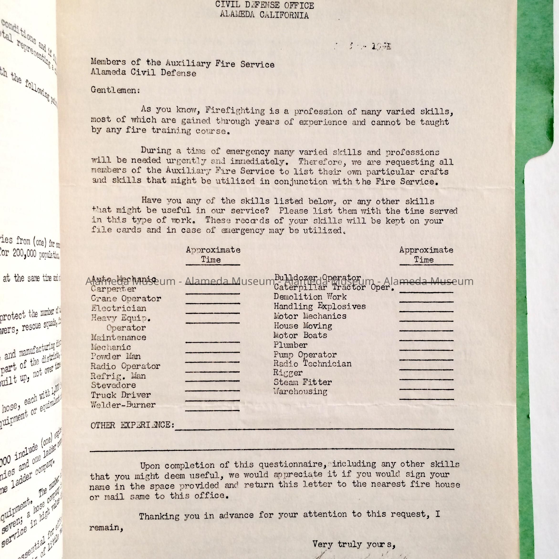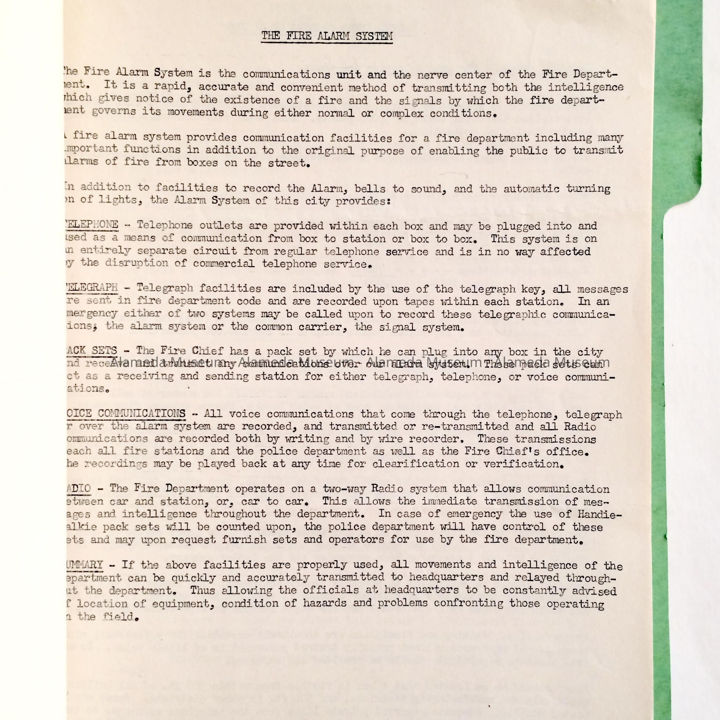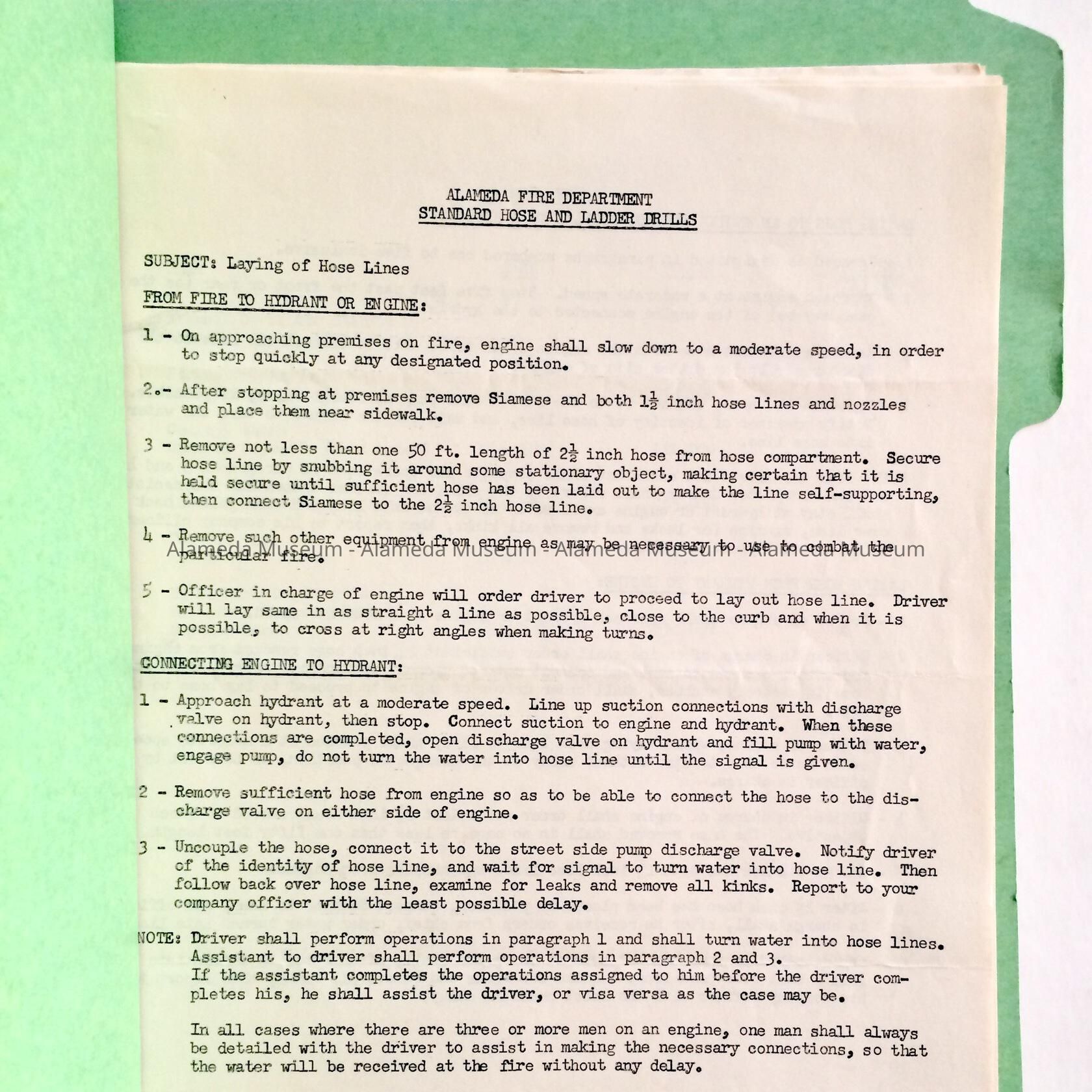 HISTORY OF OBJECT: LOOSE-LEAF FOLDER CONTAINING FLIERS, ETC., CONCERNING THE AUXILIARY FIRE DEPARTMENT'S INFORMATION, INCLUDING HOSE AND LADDER DRILLS, ALAMEDA SWIMMING POOL LOCATIONS, FIRE ALARM SYSTEMS, EQUIPMENT ON TRUCK NO. 1, FIRE INSPECTIONS, FIRE LOSSES, GENERAL ORDERS, ATOMIC EXPLOSIONS, RULES AND REGULATIONS FOR FIRE STRATEGY, ETC.