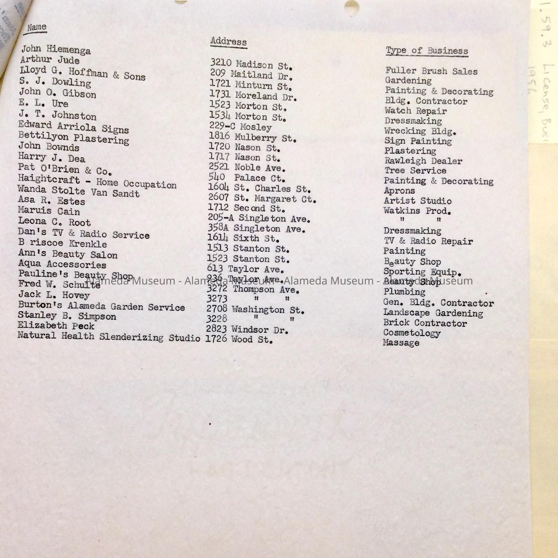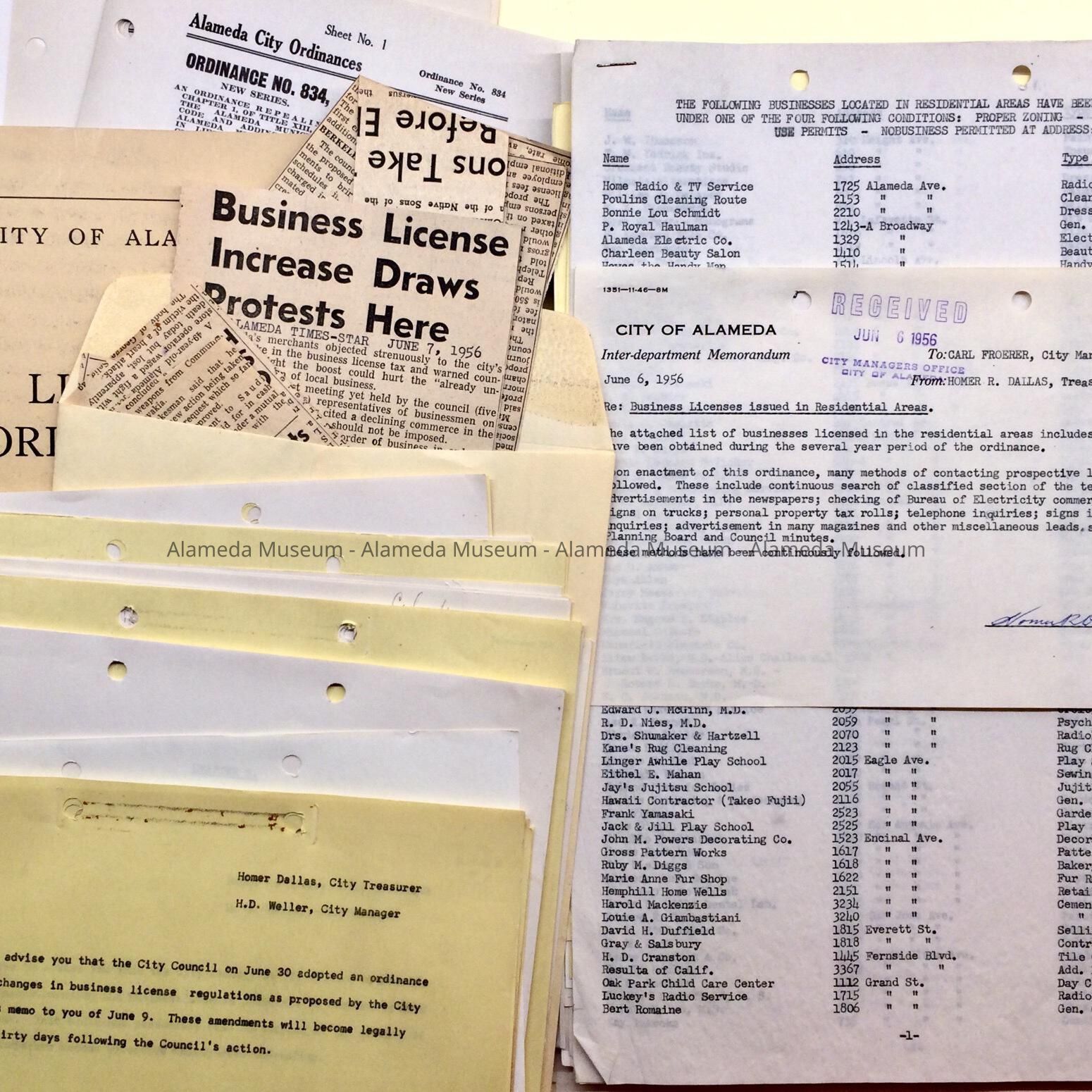 Documents found in the attic of City Hall, prior to renovations. These documents were originally in a folder (discarded in 2011) with a green label on the tab stating: "License, Business - Report and Ordinances - 1956”. Documents include: booklet of License Ordinance, i.e. Ordinance No. 834 (licenses), with pages on other business-license related ordinances; newspaper clippings about objections to an increase or raise of license fees (changed from a flat rate to percentage-based), and a list of business licenses, dated June 6, 1956. 1956 Mayor: Raymond P. Kranelly; City Manager, Carl Froerer; City Attorney Frank Annibale. 1959 City Manager H.D. Weller.