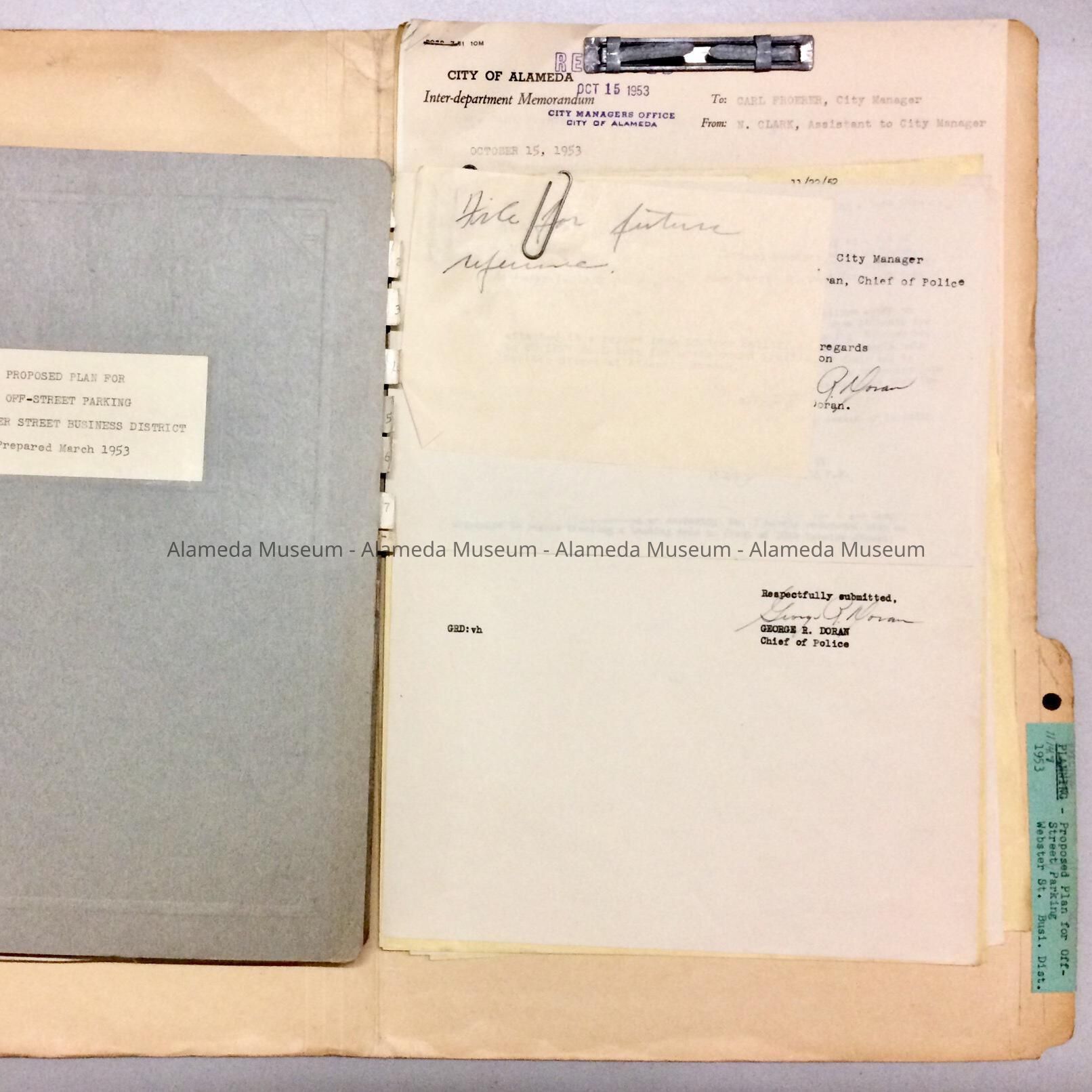 A FOLDER CONTAINING CORRESPONDENCE, STUDY DIAGRAMS, ETC., PERTAINING TO OFF-STREET PARKING IN THE WEBSTER STREET PARKING AREA, 1953.