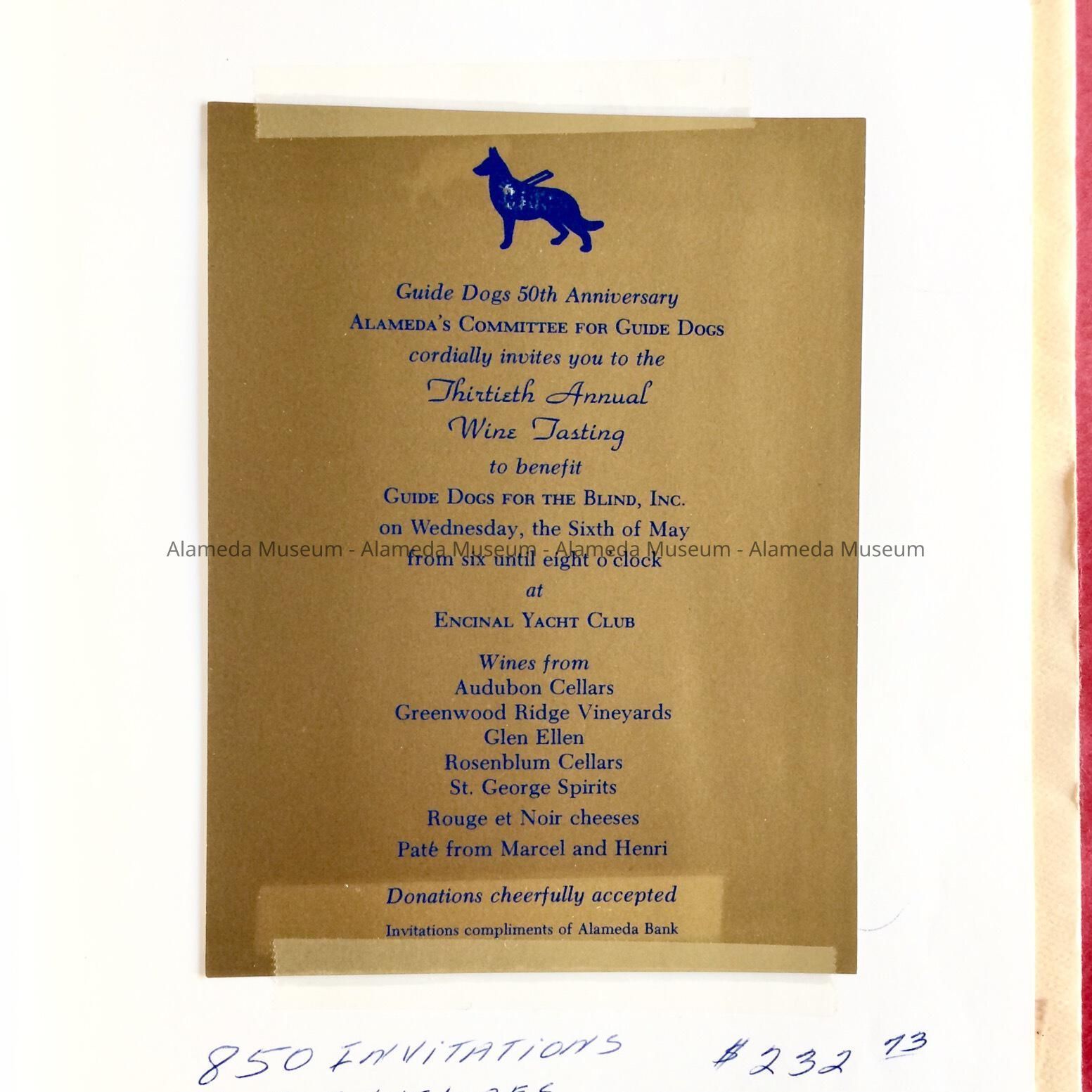A FOLDER CONTAINING INVITATIONS TO PARTIES HELD AS FUND RAISERS FOR THE ALAMEDA COMMITTEE OF GUIDE DOGS FOR THE BLIND.