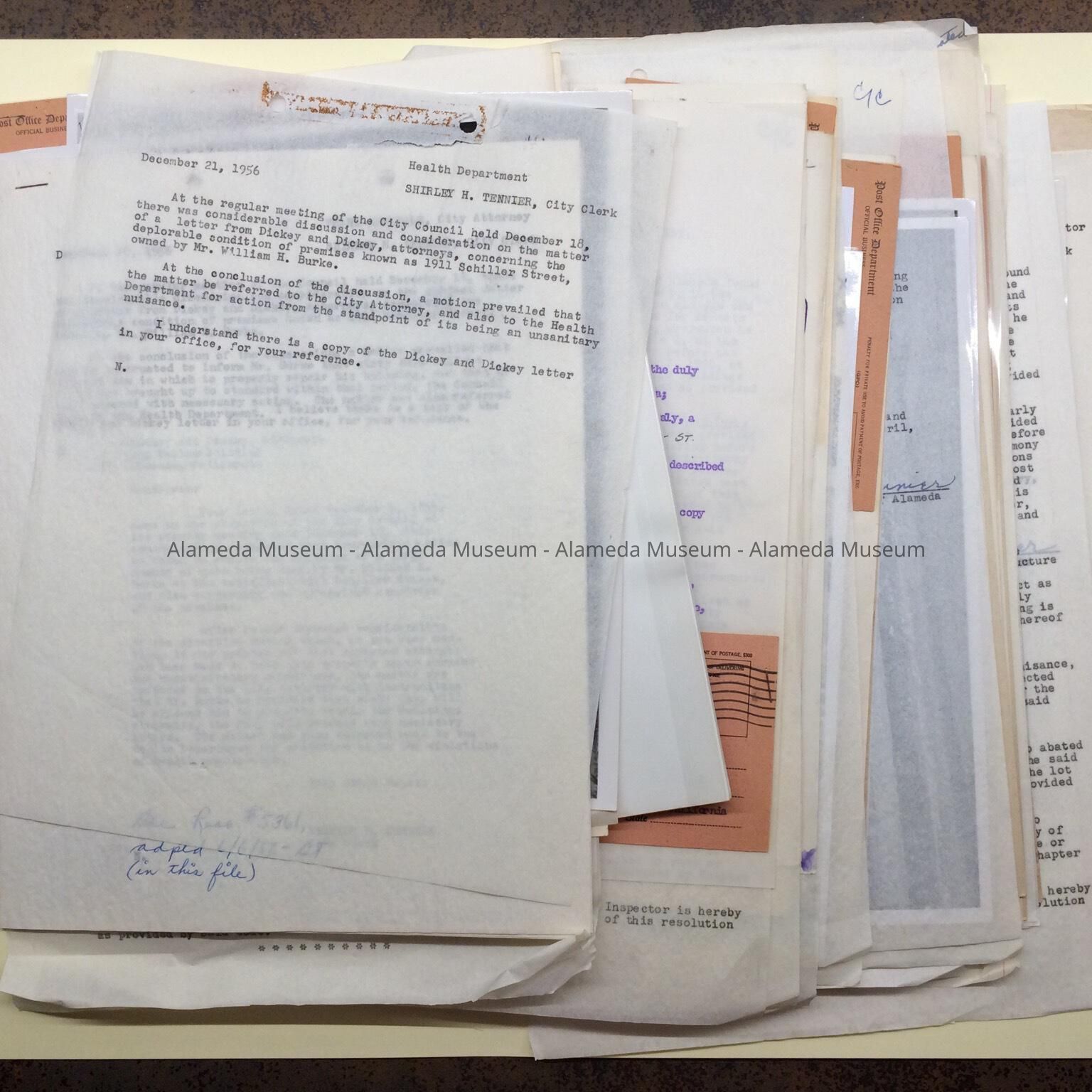 HISTORY OF OBJECTS: A FILE CONTAINING LETTERS WRITTEN TO THE HEALTH DEPARTMENT AND OTHER AGENCIES CONCERNING PROPERTIES WITHIN THE CITY OF ALAMEDA, WHICH WERE CONSIDERED "DILAPIDATED," OR IN NEED OF REPAIRS. ALSO INCLUDED ARE, "NOTICES TO ABATE NUISANCES," POSTED ON ONE OF THE LISTED HOMES. FILE ALSO INCLUDES PHOTOS OF SOME OF THE BUILDINGS USED AS EVIDENCE. IN ONE OR MORE INCIDENTS REPORTS INCLUDED HOUSES THAT HAD FIRE DAMAGE.