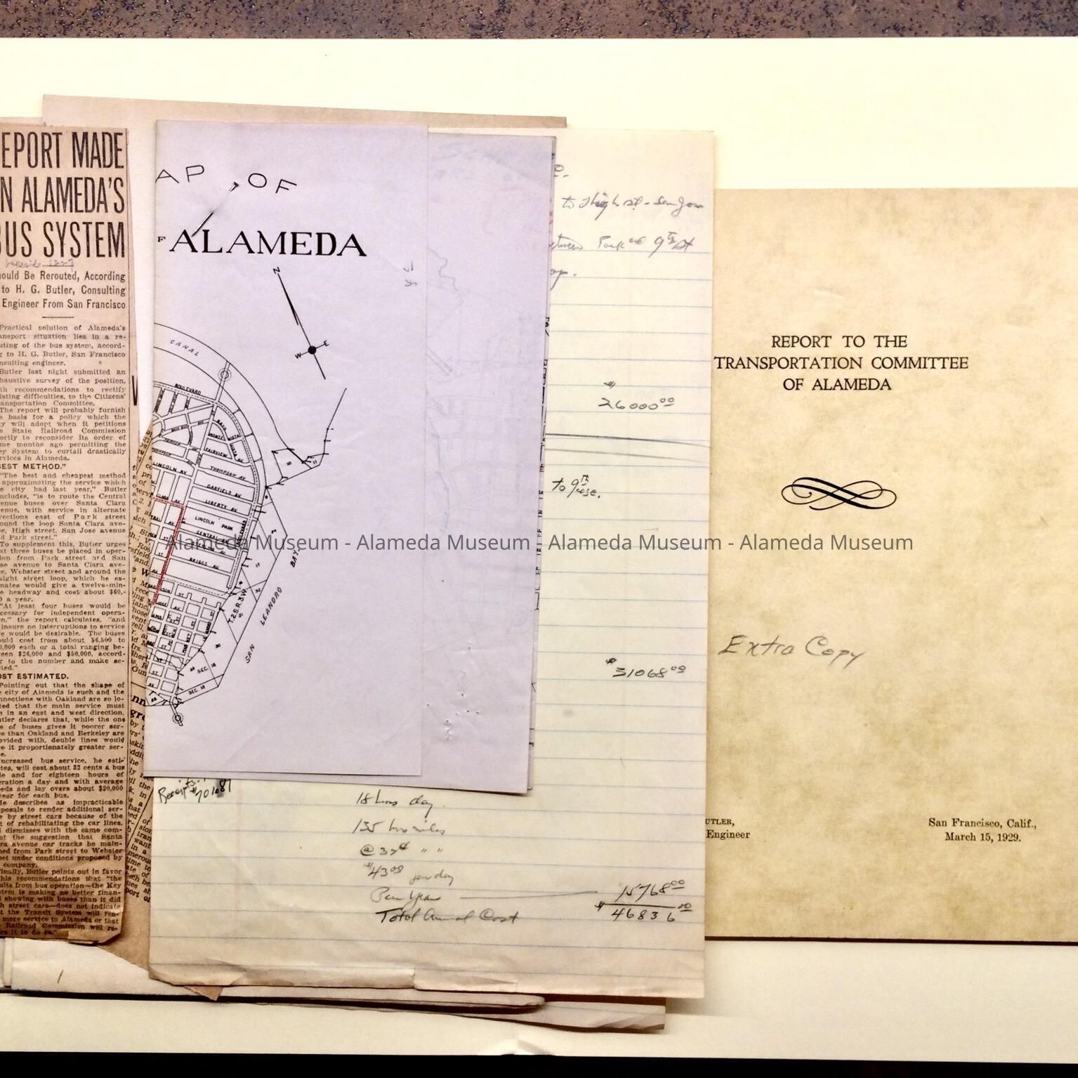 NEWSPAPER CLIPPINGS CONCERNING A KEY SYSTEM OF BUS VEHICLES IN THE CITY OF ALAMEDA DURING THE LATE 1920's. INCLUDED IS A MAP DISPLAYING THE ROUTE OF THE MUNICIPAL BUS SYSTEM.