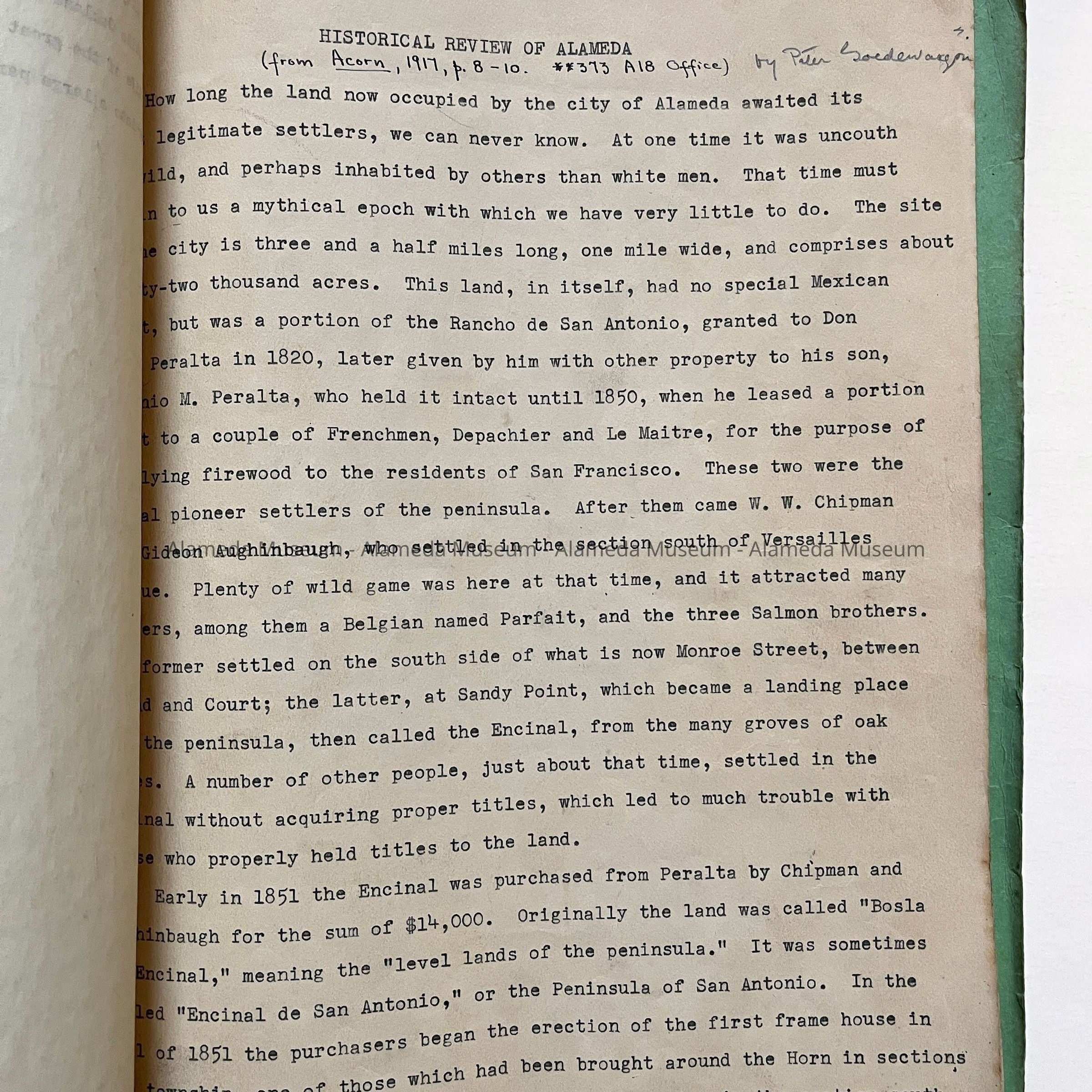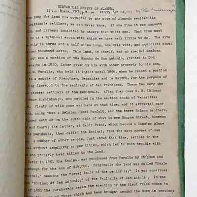 History of Object: 3 typed essays, apparently at least one for a California History class (which received an 'A'). First essay is undated, titled 'ALAMEDA', by Isabel Curtis, 6 pages; second essay has no title or name, 3 pages; 3rd essay is titled 'HISTORICAL REVIEW OF ALAMEDA', and has handwritten: 'from Acorn, 1917, p 9-10. **373 A18 Office) by Peter Goedewagon', 6 pages.