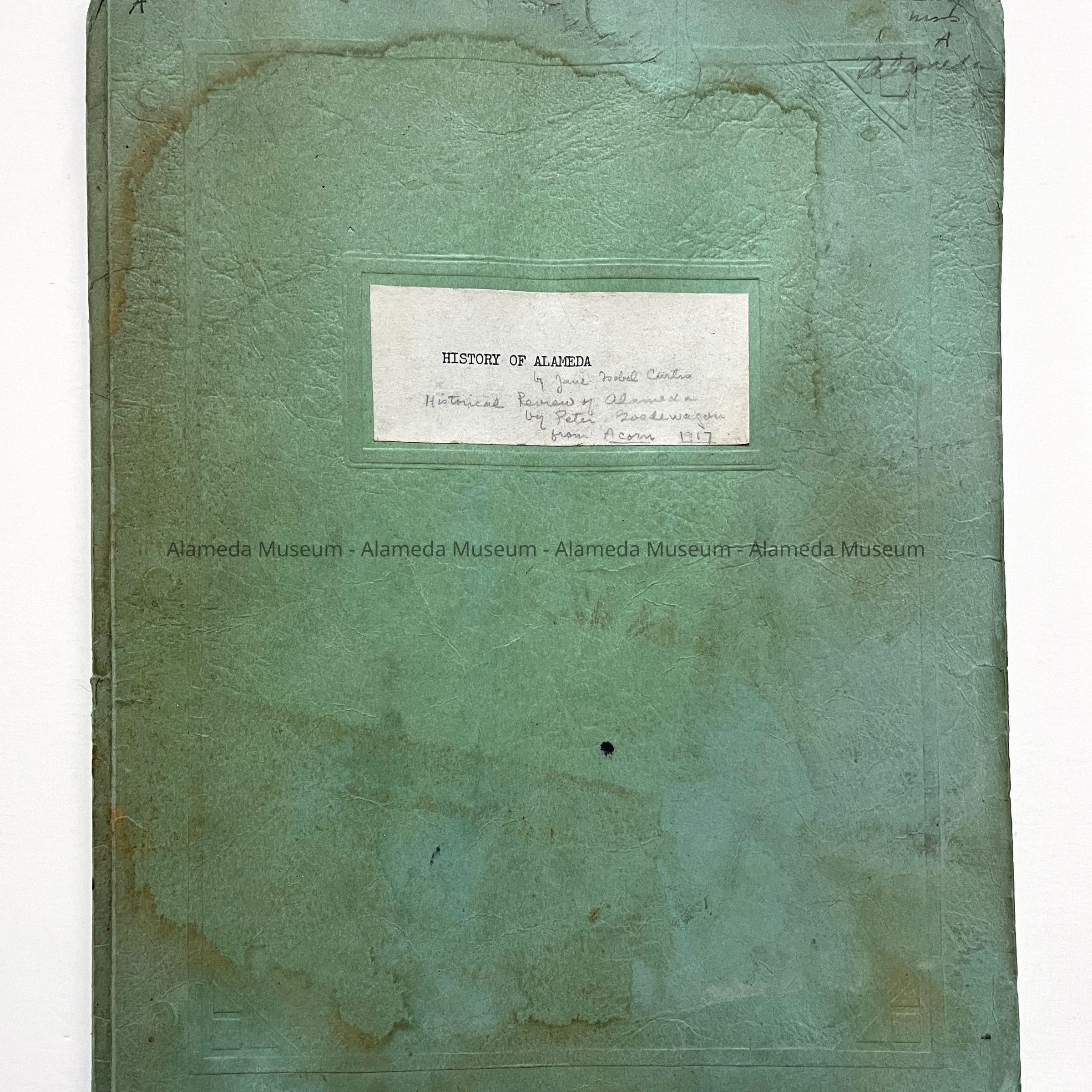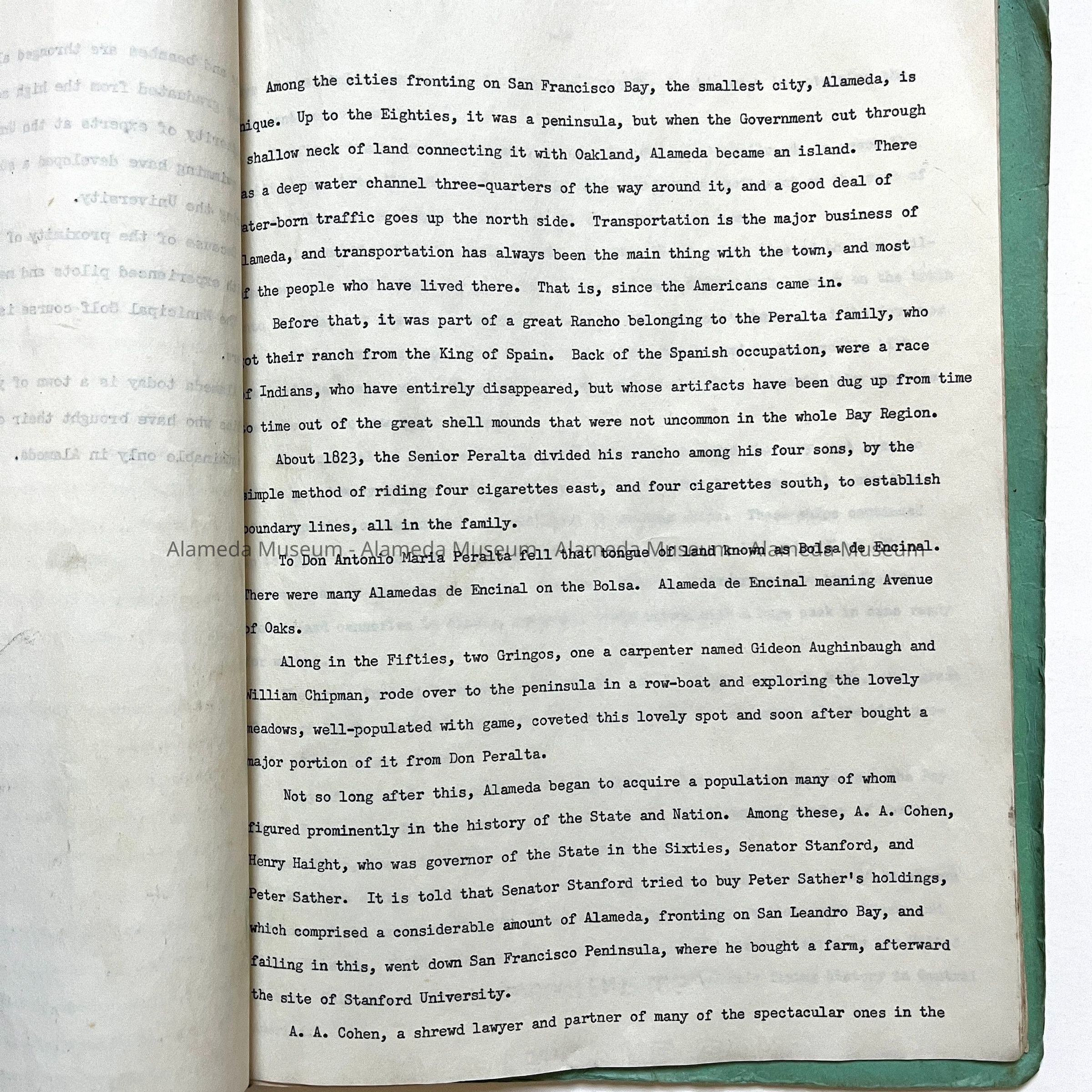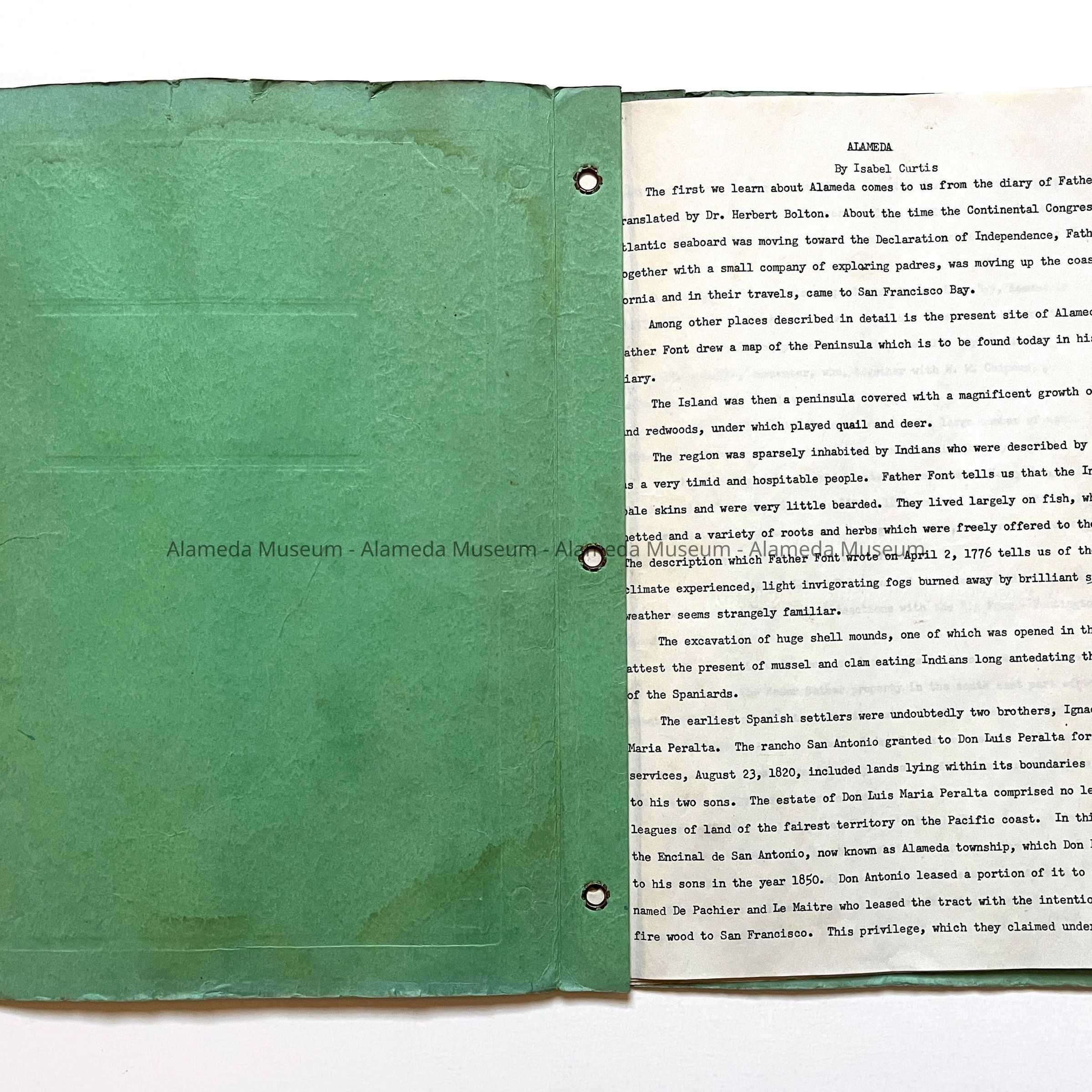Description: A mint green folder with covers of card stock, containing typewritten pages. A label on the front has typed: 'HISTORY OF ALAMEDA', and additional information handwritten in pencil. At top right, there is additional handwritten words, what appears to be 'Calif. / Mss / A / Alameda'. Papers are three-hole punched and gathered with brass split pins.