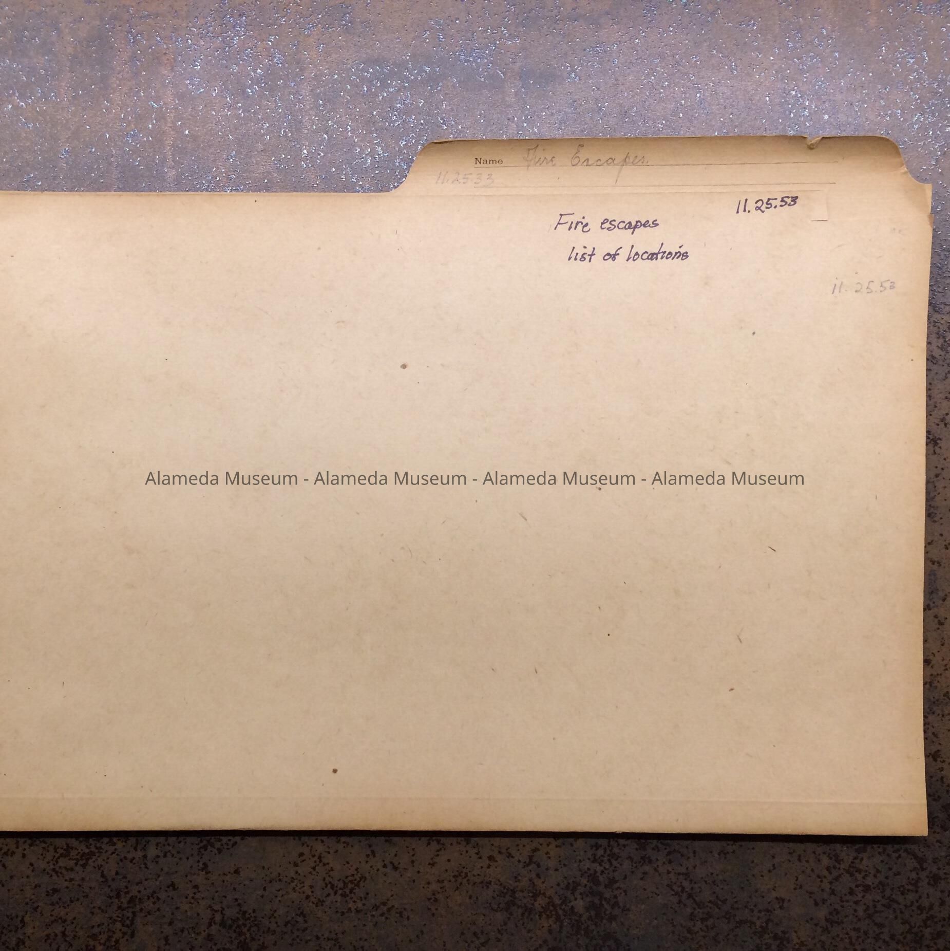 A FILE FOLDER CONTAINING A REPORT ON INSPECTION OF FIRE ESCAPES AND THEIR LOCATIONS.