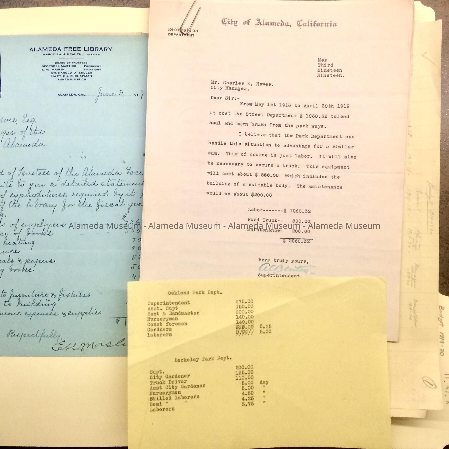 Description: Acid free legal size manila file folder labelled "Budget 1919-20", penciled on the tab. Contents include handwritten yellow lined papers marked 1 to 23, and 27, handwritten information on Alameda Free Library stationery, and printed papers.