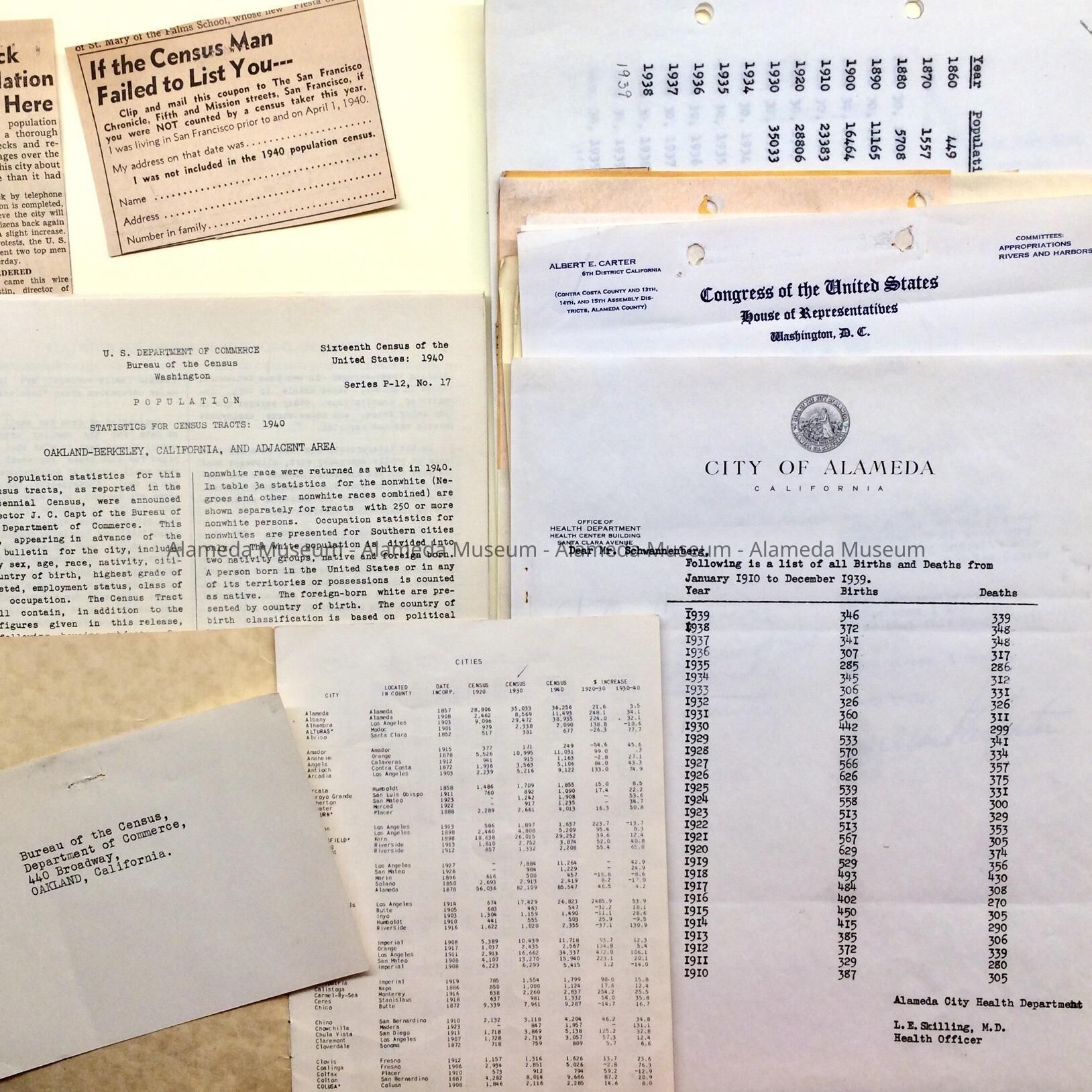 Documents found in the attic of City Hall, prior to renovations. These documents were originally held together with a metal clip in a folder (discarded in 2011) with the tab stating: “Census - City of Alameda - 1940”. Documents describe a preliminary result from the census apparently giving a lower number of residents than based on housing surveys, and correspondence regarding a recount. Also includes an undated booklet titled ‘The 1940 Population of the Cities and Counties of California’, publisher William R. Staats Co., which includes statistics from the 1920, 1930, 1940 Census; City Health Department listing of Births and Deaths 1910-1939 (probably dated 1940, L.E. Skilling, Health Officer, to Mr. Schwanenberg, City Mgr), and an excerpt from the U.S. Census Bureau, from 1942, of Population Statistics for Oakland-Berkeley and Adjacent Area.