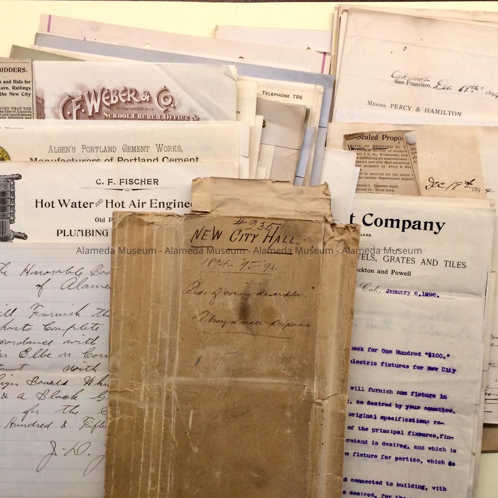 Documents found in the attic of City Hall. The documents in this folder pertain to the construction of City Hall, 1890-1896. Includes an original file folder cover stating ‘#235 New City Hall 1894-1896; Bids of every description; Many small papers”, which likely held a collection of bids to Messrs. Percy & Hamilton, architects, included in this folder. Bids for each phase are included from concrete pouring to plumbing which include a notice on newspaper; includes a 1890 proposal to install street lights, and a drawing for windows.