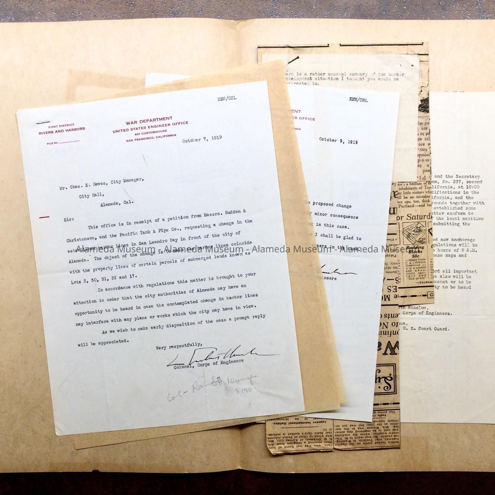 HISTORY OF OBJECT: A FILE FOLDER CONTAINING COPIES OF CORRESPONDENCE CONCERNING ANCHORAGE, ETC., ON THE ESTUARY AND SAN LEANDRO BAY.