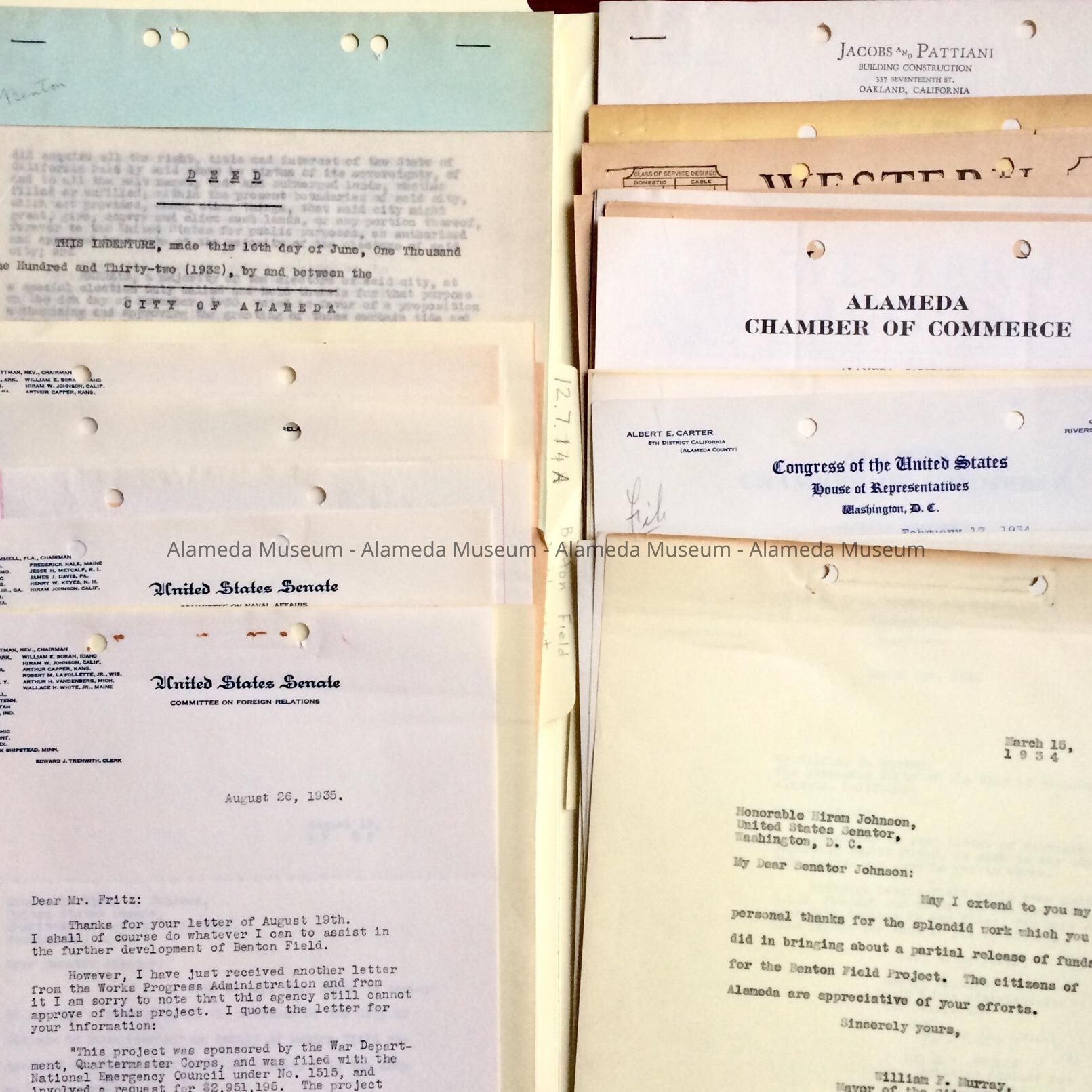 A. Folder, with the 1932 deed of the Benton Field property, 1935 resolution to correct the deed (Council: Broyles, Eschen, Morris, Munro, president Roebke; City Clerk, S. G. Blood), and correspondence which shows attempts by City Manager Fritz to get funding for the project, including from the Works Progress Administration, U.S. Senate and House representatives, and the Navy; B. Folder, with 1932 correspondence of City Manager Ralph M. Bryant, including laying of drainage pipes, and copies of 1932-1934 efforts by Mayor William F. Murray, to ensure government funds.