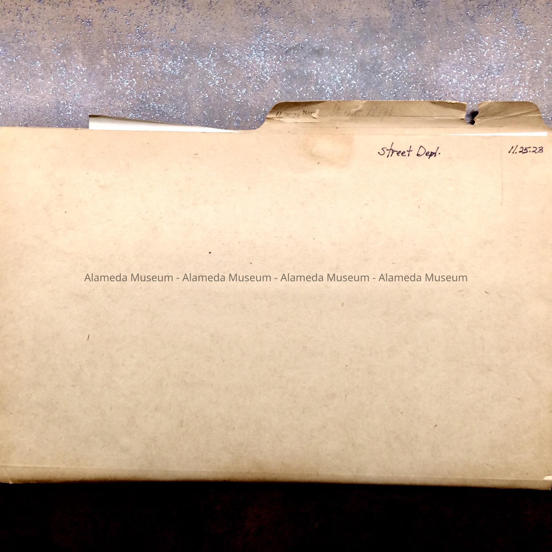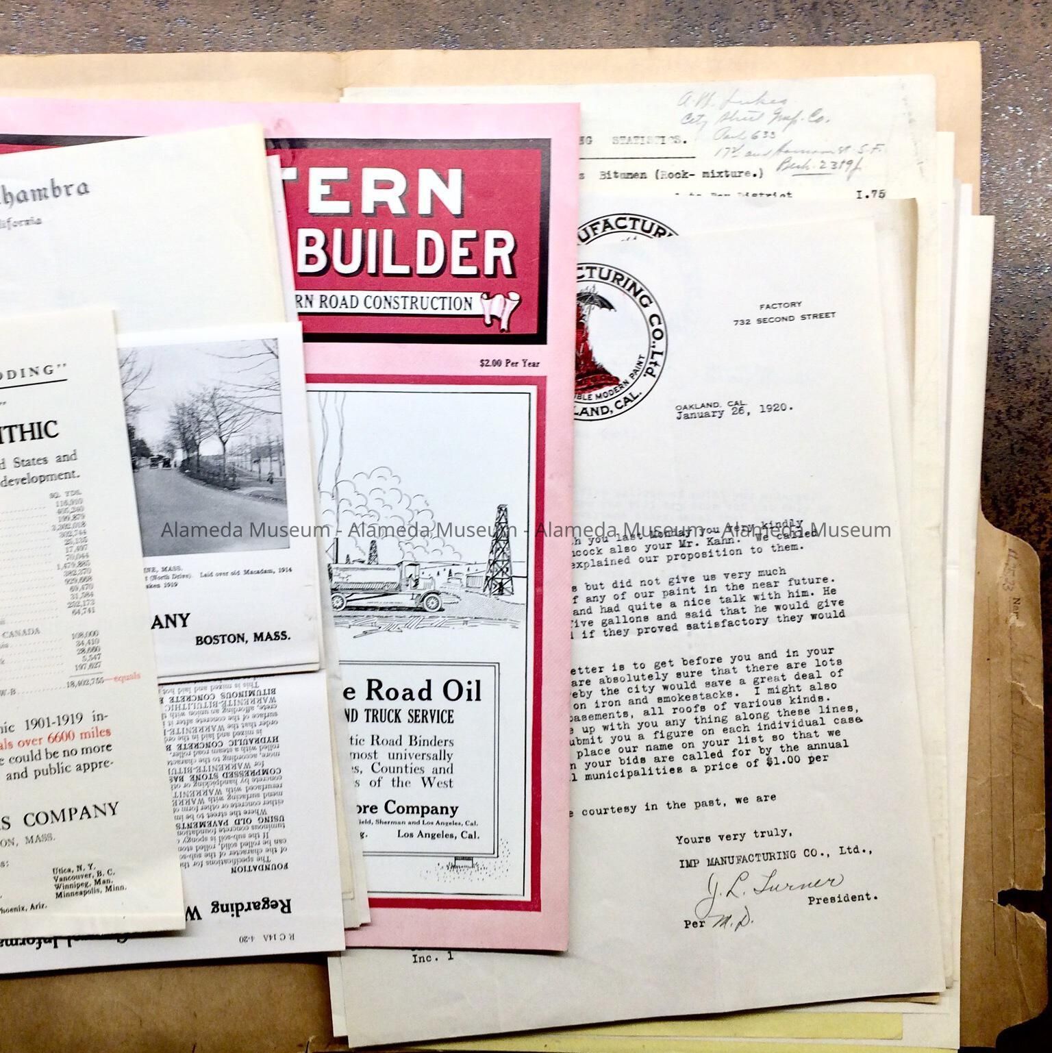 A FILE FOLDER CONTAINING CORRESPONDENCE, ETC. DIRECTED TOWARD THE CITY OF ALAMEDA CONCERNING STREET PAVING BY COMPANIES THAT MANUFACTURE ROAD MATERIALS.