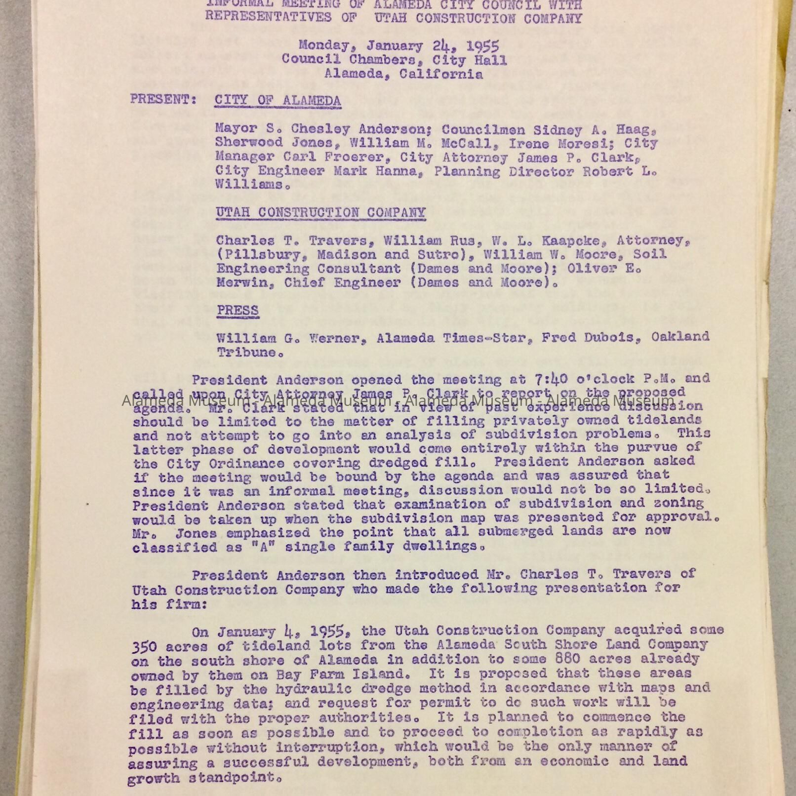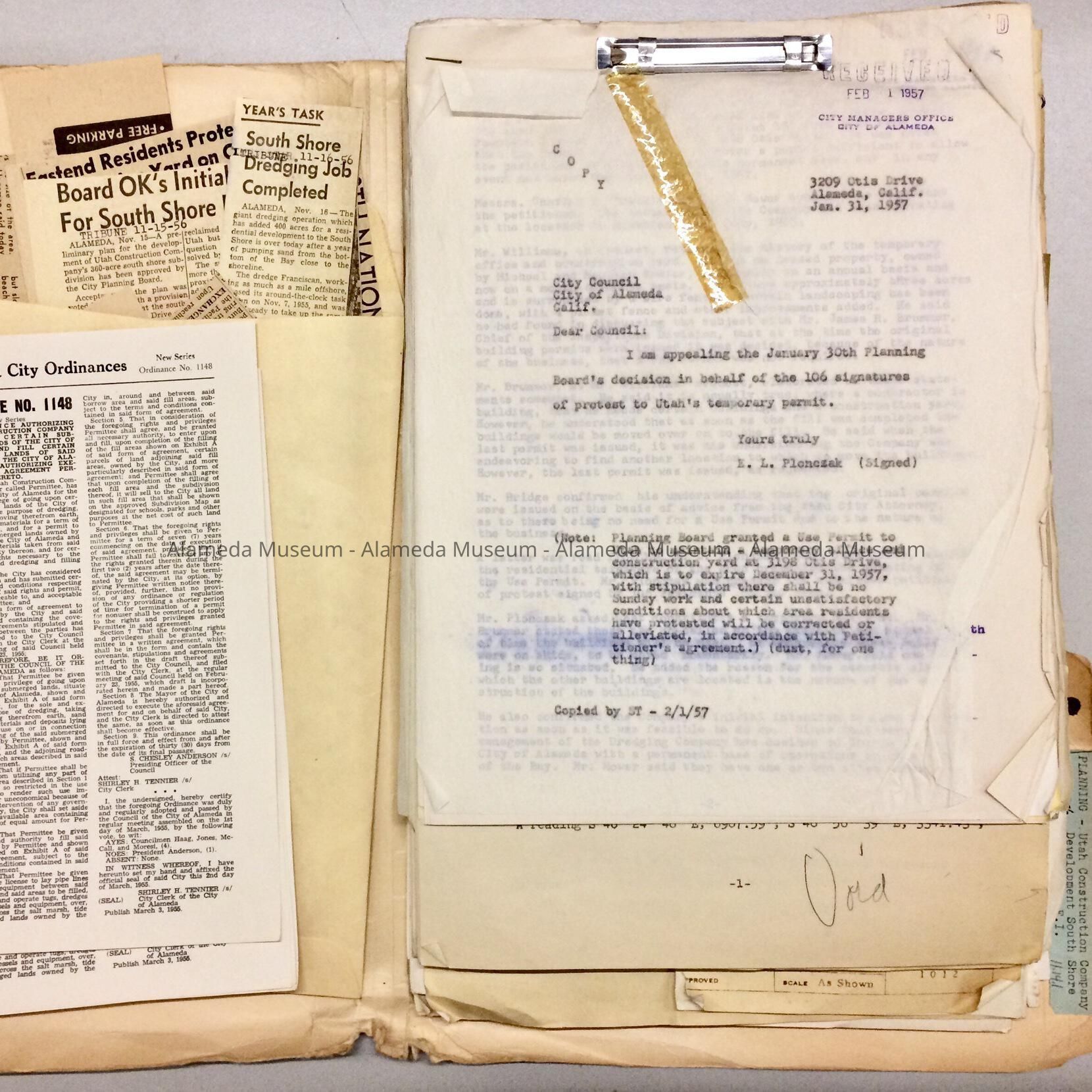 A FILE CONTAINING CORRESPONDENCE, MAPS, ETC., PERTAINING TO THE UTAH CONSTRUCTION COMPANY'S DEVELOPMENT OF SOUTH SHORE AND BAY FARM ISLAND FOR THE PERIOD 1951-56.