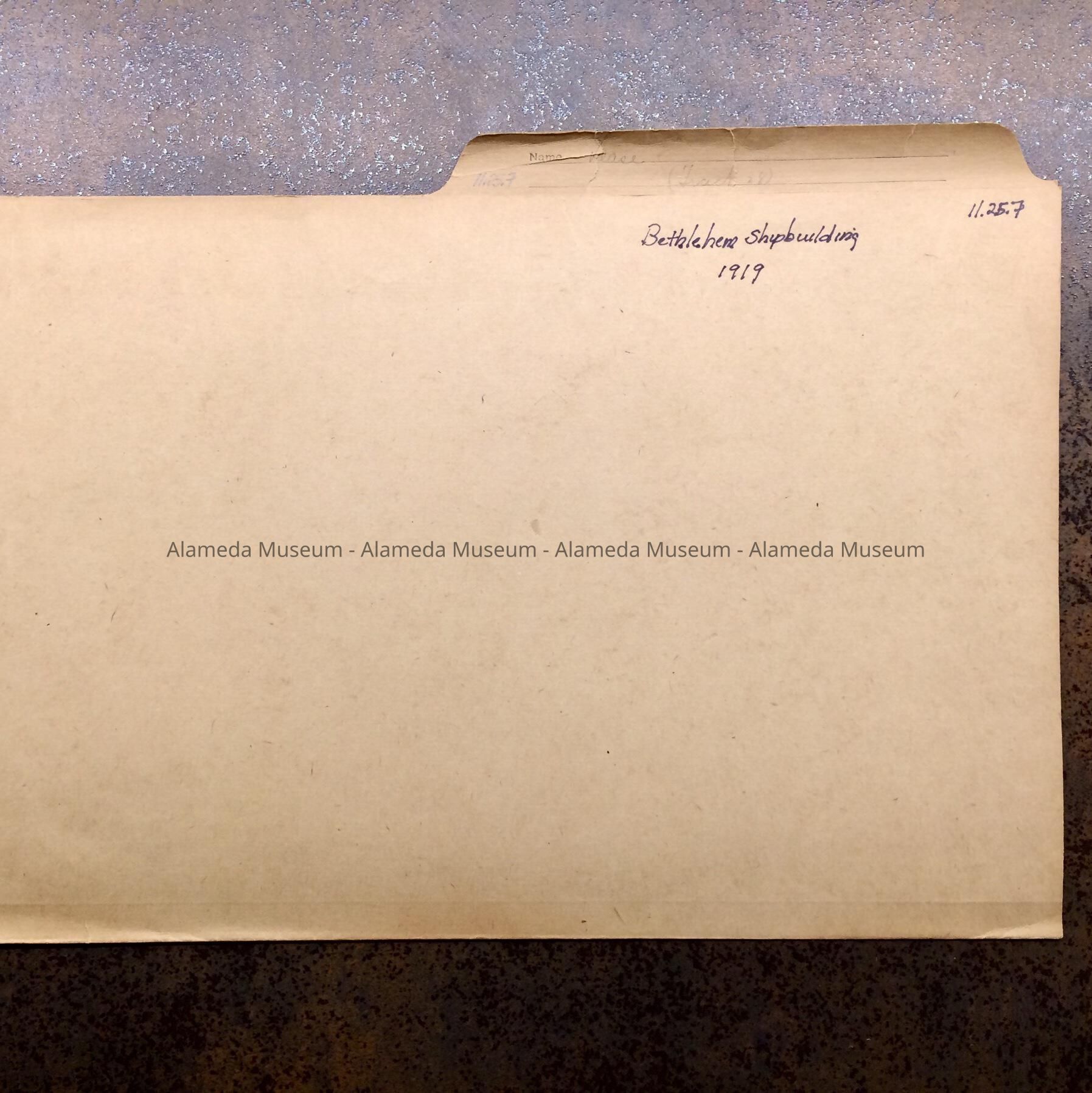 HISTORY OF OBJECT: A FILE FOLDER CONTAINING CORRESPONDENCE ADDRESSED TO BETHLEHEM STEEL AND SHIPBUILDING CORPORATION IN SAN FRANCISCO AND REPLIES FROM THE CITY MANAGER OF ALAMEDA.