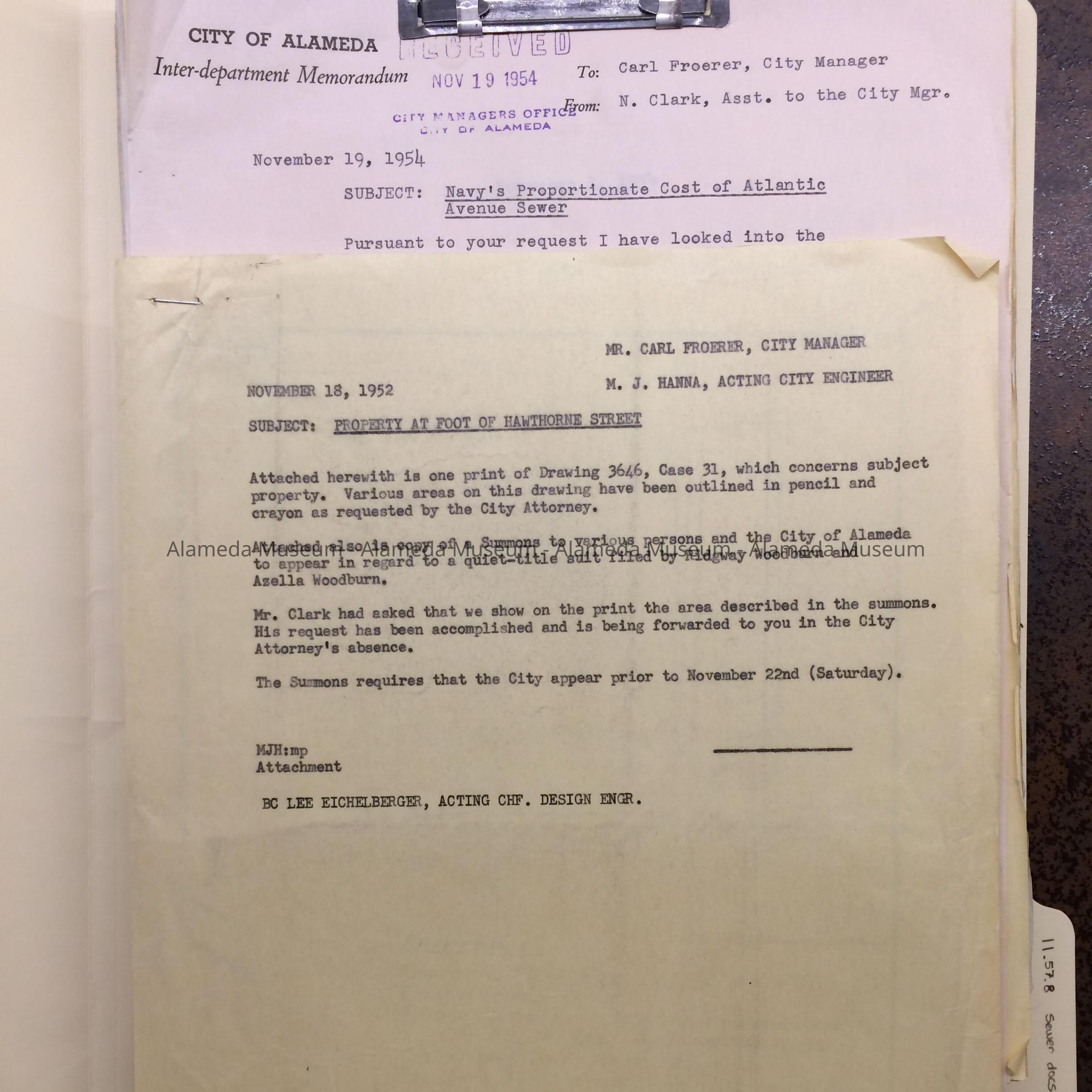 History of Object: Documents and maps regarding sewers, and sewage pumping stations. Includes letter with William G. Paden signature authorizing contract on Taylor Avenue to use funds from Board of Education, for connecting the High School to a main line. Also includes a letter from Encinal Terminals, claiming a reimbursement for reworked sewer lines on former Alaska Packers property that needed to be changed for the Kieckhofer Container Company plant and the Stokely Foods warehouse (1950). Also the Alameda Hotel kitchen was blocking their sewer with bones.