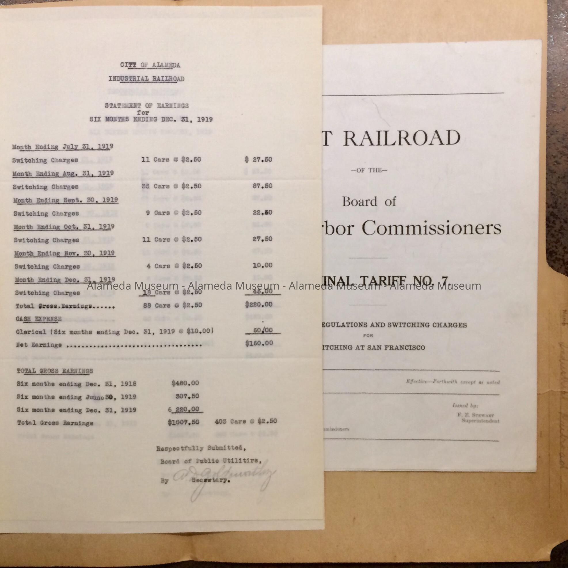 History of Object: Earning statement of Alameda Industrial Railroad, later called the Beltline, and a Pamphlet of regulations and switching charges for a similar railroad in San Francisco, for comparative pricing.