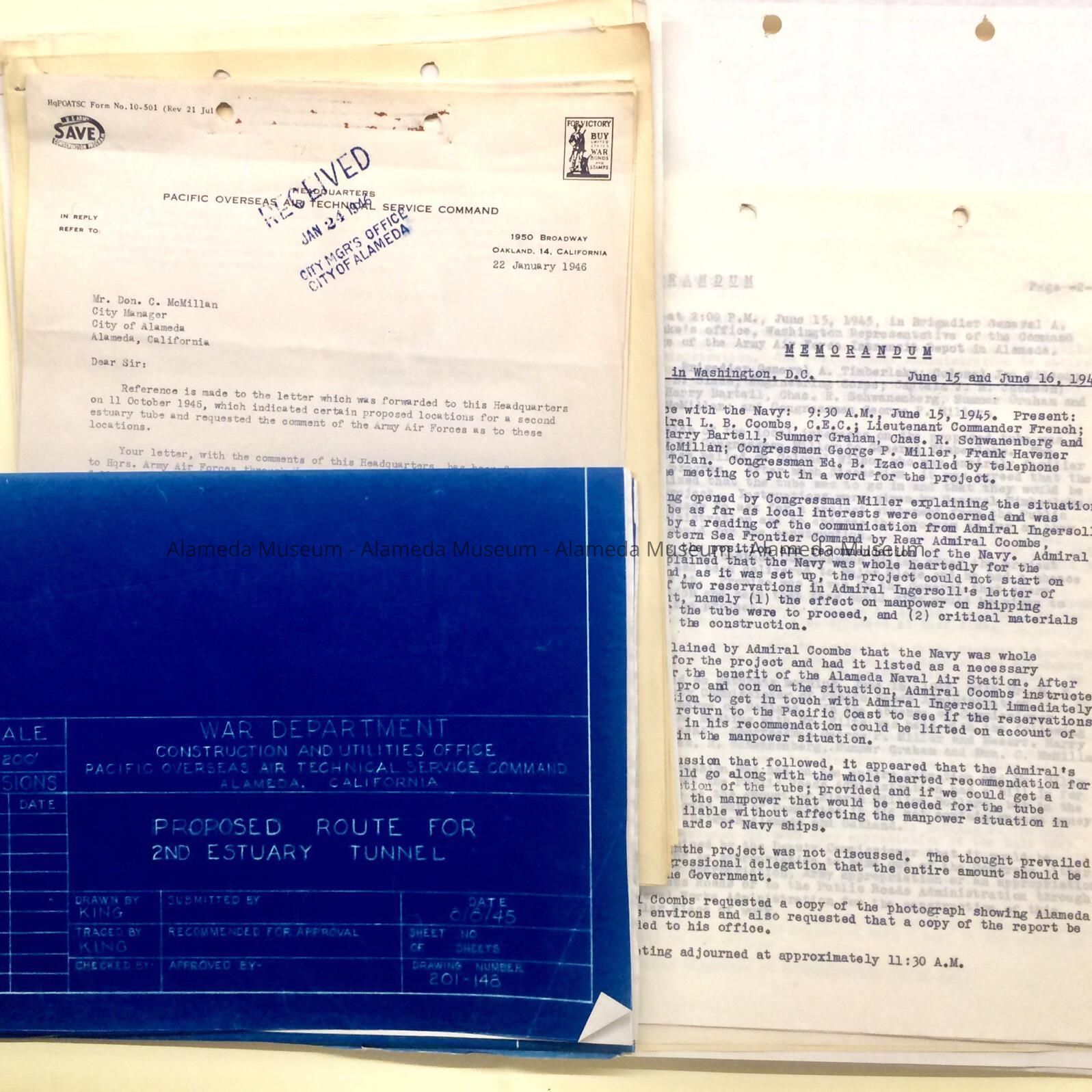 History of Object: Papers found in the attic of City Hall, in a folder (discarded in 2011), which had a tab label stating: ‘Transportation - Tube -Post Washington Trip - June 1945’. The maps also show the location of now disappeared NAS Civilian Housing streets between Mitchell Avenue, Atlantic Avenue, and Webster: Alywin Court, Bainbridge, Gibbs, George, Tynan, Tinker, Andrews, and Weaver Ave (most running SE to NW), and Tunnel, Wadsworth, Colin Kelly, Walker, and Corkille Streets.