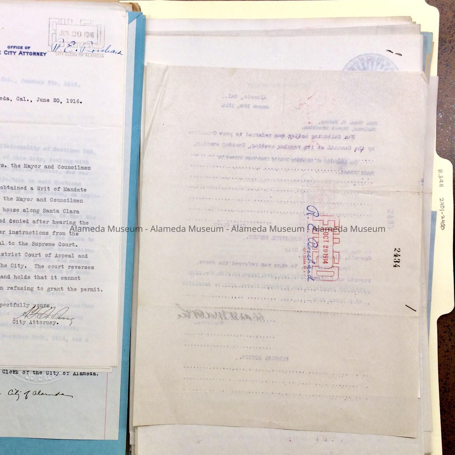 Miscellaneous documents from / to the council and/or mayor of Alameda, started in 1914 with earlier and later additions, found in the attic of City Hall during remodeling in the 1990s. Documents in this folder include: Item 2428 - parking garage for city hall; Item 2425- New electrical rates.; Item 2427#3 - Letter from P.P.I.E asking what the city had planned for "Alameda Day" at the Exposition. Interesting stationery: Item 2442 - Letterhead for West End Building Assoc.; Item 2444 - Letterhead for Aeolian Yacht Club; Item 24390 Signature of Henry H. Meyers; Item 2422 - Letterhead of Edward L. Braswell Co.
