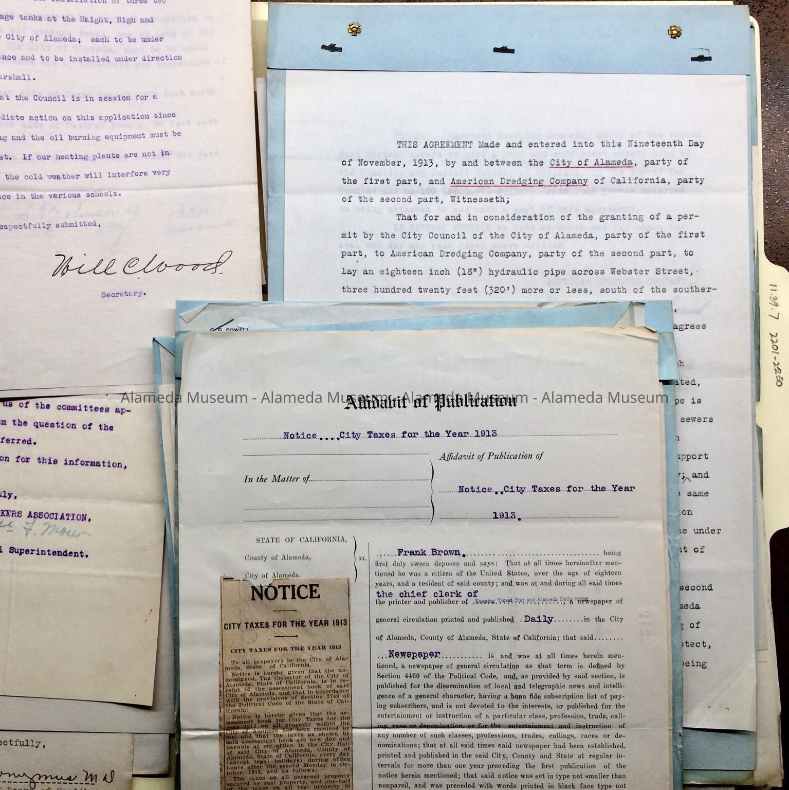 Miscellaneous documents from / to the council and/or mayor of Alameda, started in 1913 with earlier and later additions, found in the attic of City Hall during remodeling in the 1990s. Documents in this folder include: reports and budgets from various city departments for 1913-1914 timeframe; personnel matters for same period, including Item 2237 - appointment of Miss Inez Smith as Bacteriologist and Chemist, by A. Hieronymous, City Health Officer, and Item 2206 with a 1916 list of City officials and their solvency; petitions or suggestions for street improvements, and water wells, storage tanks, etc., ditto, including completed work by the Hutchinson Company, . Also matters affecting property lines, such as Item 2232 which includes a letter from Hally & Co, real estate & insurance, 2315 Santa Clara Ave. In Item 2234 from K. Taylor, Attorney At Law suggests implementing a license fee on cars, and in 2203 a proposed public natatorium is mentioned.