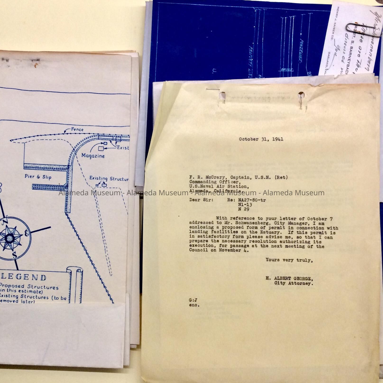 Documents found in City Hall attic during remodel in the 1990s, placed in a new folder after donation to the museum in 2011. Tab of original folder (now discarded) stated: "Naval Air Station - Development 1937-1938-1939. Correspondence regarding construction of NAS Alameda. Includes
