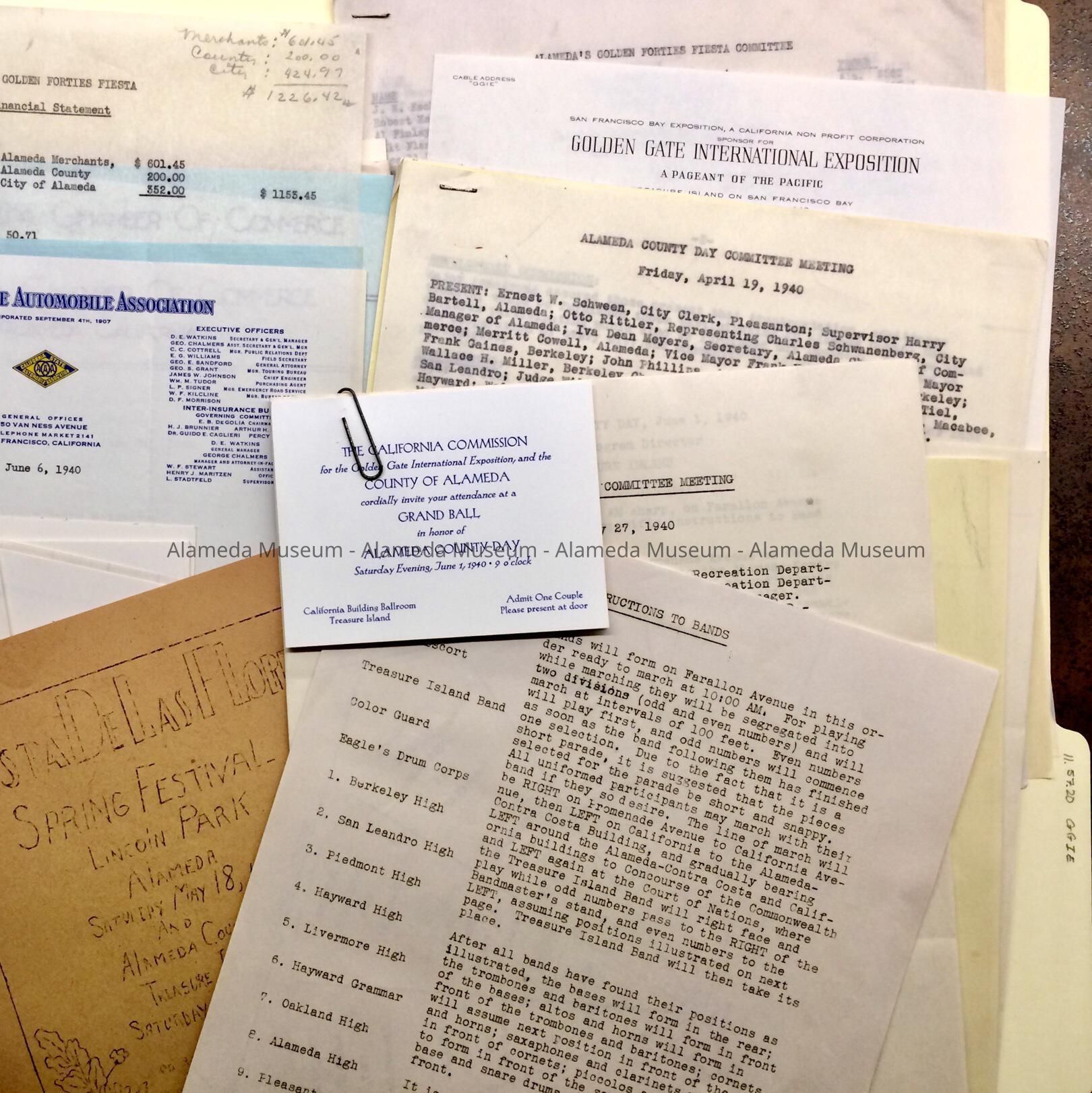 Documents found in City Hall attic during remodel in the 1990s, placed in a new folder after donation to the museum in 2011. Documents in this folder pertain to plans, programs, budget overview, and thank-you notes regarding: the 1940 Alameda County Day at the Golden Gate International Expo, including a Golden Forties Fiesta with Pet Parade, Band competition, and Queen (of Alameda) election; Safety Patrol Day; Fiesta de las Flores/Spring Festival at Lincoln Park. Persons involved from City Hall: Mayor Henry A. Weichhart, City Manager Chas. R. Schwanenberg, Superintendent of Parks Otto Rittler, Geraldine T. Leydecker Supervisor of Recreation. Includes map of 1939 exposition.