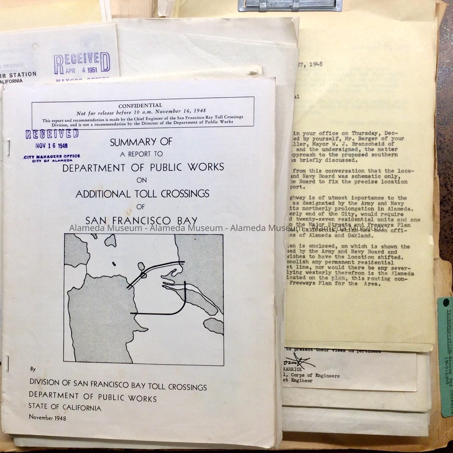History of Object: Folder found in the attic of City Hall in the 1990s. The documents in this folder pertain to plans to create crossings of the San Francisco Bay in addition to the Bay Bridge. Includes reports from the State Department of Public Works with blueprints, report from the State Highway Department, and 1947-1948 correspondence about a rough drawing which suggested an approach needing demolition of a number of dwellings and a school, and 1951 correspondence from NAS commander Lamade to Mayor Branscheid.