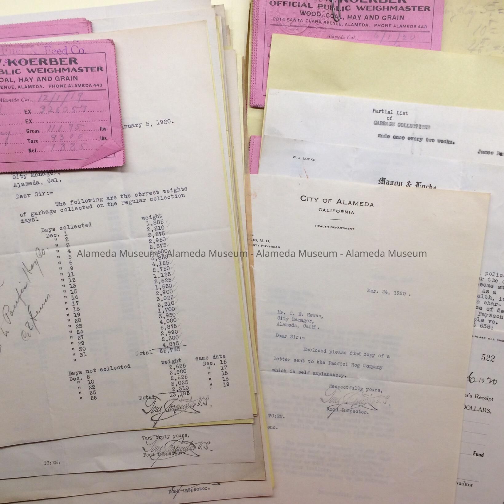Folder with documents relating to garbage collection 1919-1920, including accounting of garbage weighted by A.H.W. Koerber, 2314 Santa Clara, and sold to the Pacific Hog Company, shortages in number of barrels for the collection and a missed pick-up at Neptune Beach, a request for information from San Jose, request for compensation for loss of contract by Lekos brothers, who collected from the Union Hotel run by Mrs. Pereira, near the Bethlehem Shipyards, voided by the City Ordinance; and a health issue with garbage for chickens at 1549 Mozart Street. City Manager, C. E. Hewes.